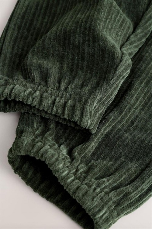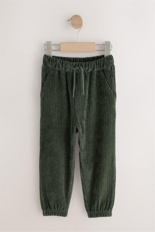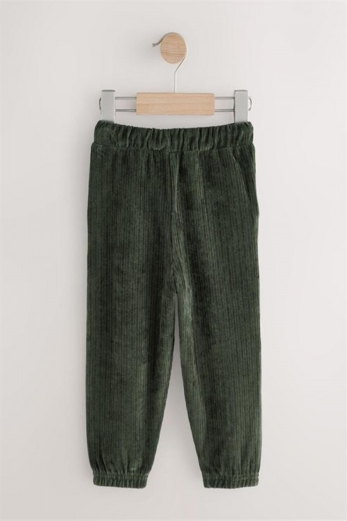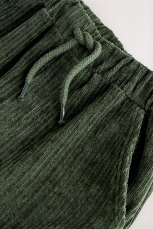Стилни детски панталони от кадифе в тъмнозелен цвят. С eластична талия и връзки за регулиране на ширината. Със странични джобове и ластични маншети, тези панталони съчетават удобство и издръжливост – перфектни за ежедневни приключения.