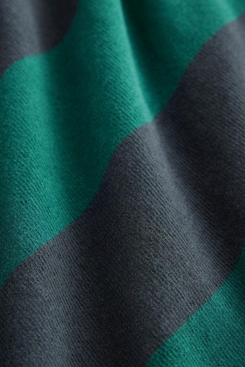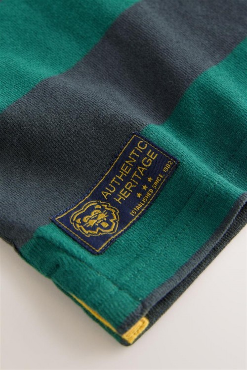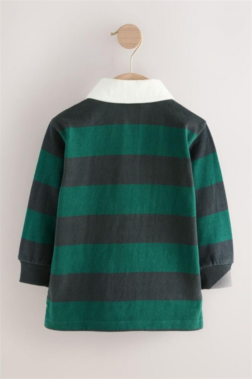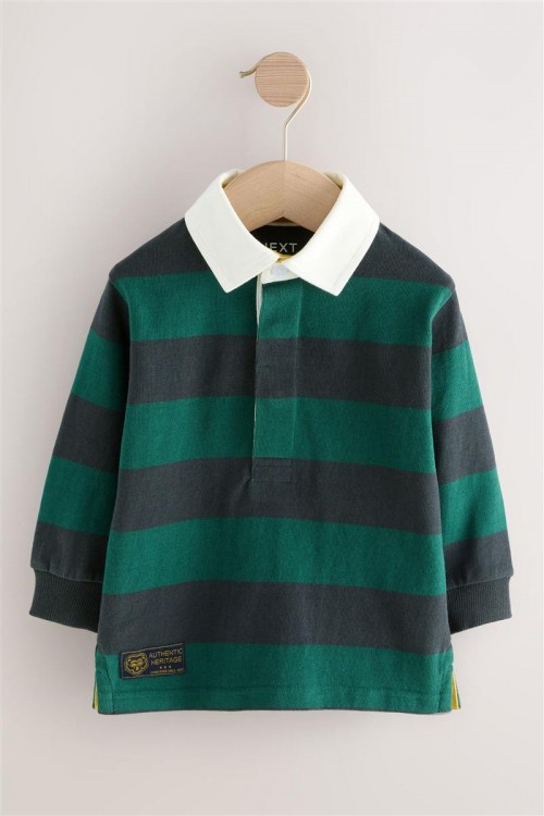 Класическа ръгби блуза с широки зелени и тъмносини райета. Дизайнът е допълнен с бяла яка и дълъг ръкав, които съчетават спортен стил и ежедневен комфорт. Изработена от мек памук, блузата е подходяща за училище, разходки или игри навън
