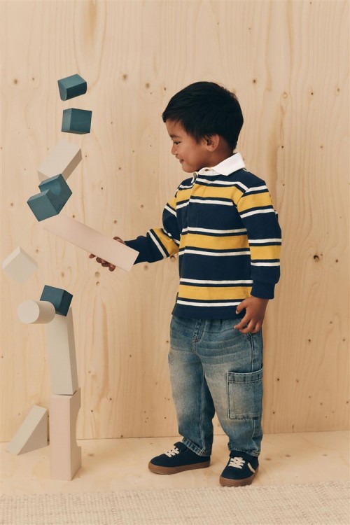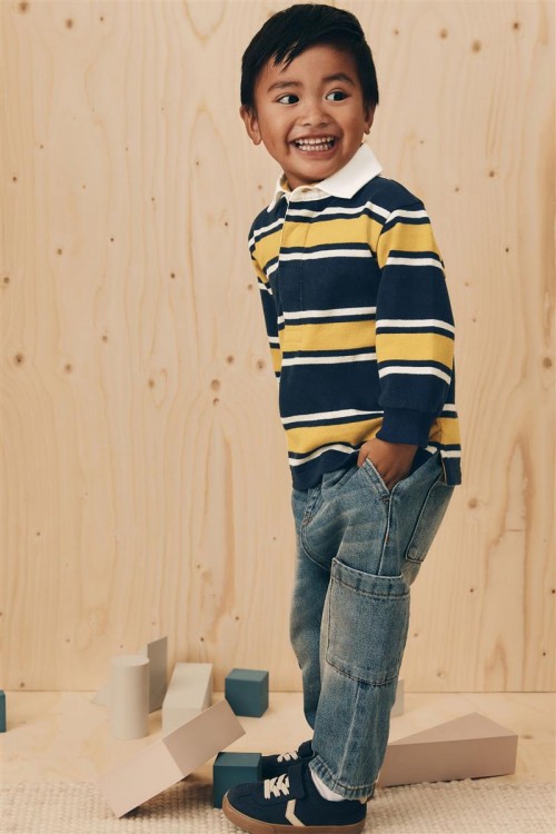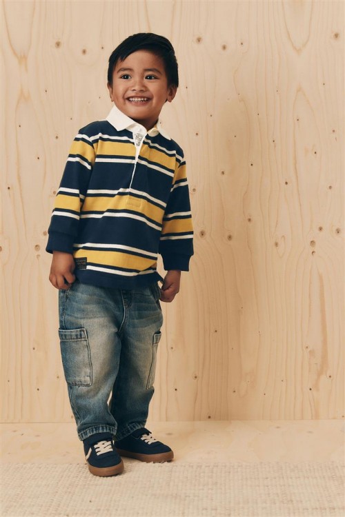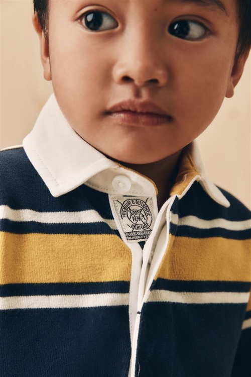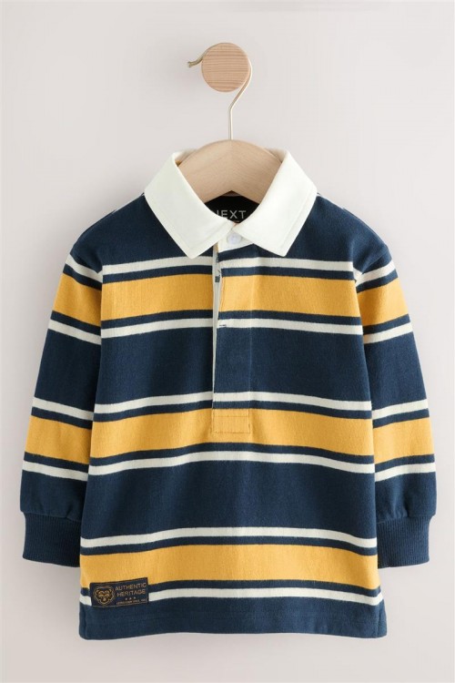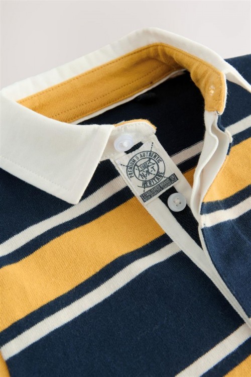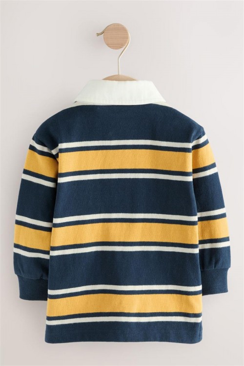 Класическа ръгби блуза с дълъг ръкав в тъмносини, жълти и бели райета. С елегантна бяла яка и мека памучна материя, този модел е удобен и стилен за ежедневието. Подходящ за носене самостоятелно или като част от наслоен аутфит.