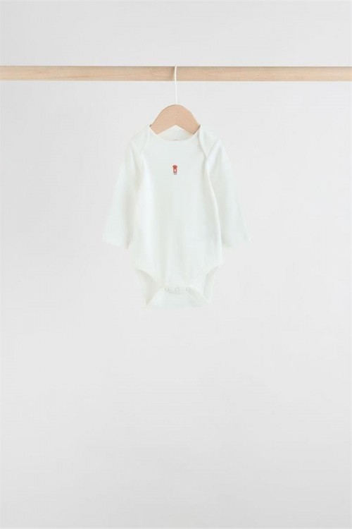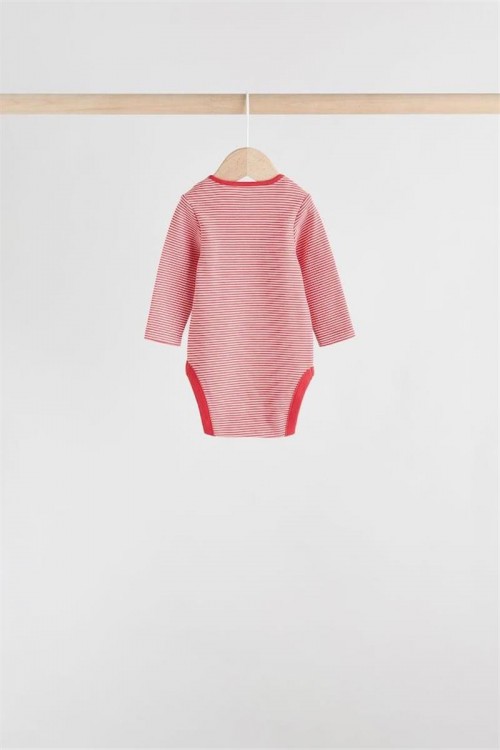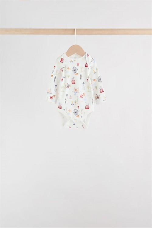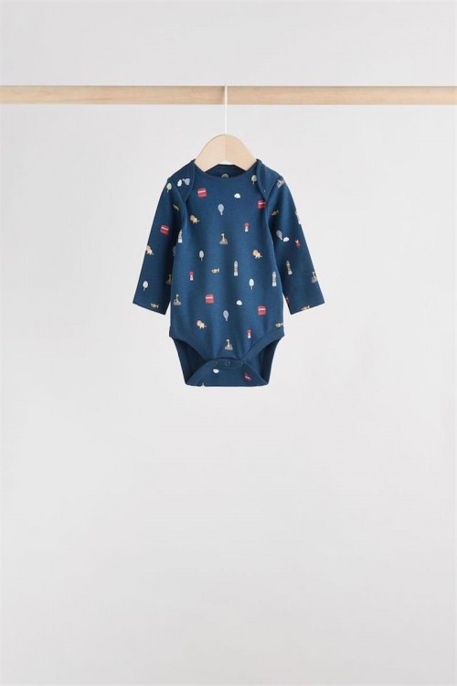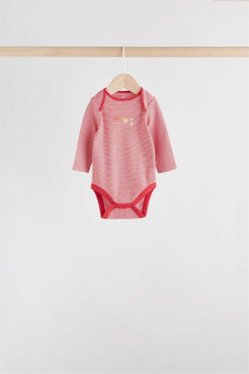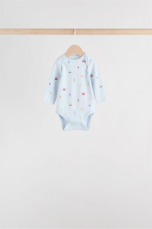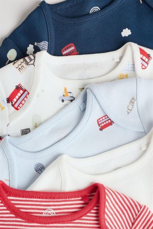 Комплект от пет бебешки бодита с дълъг ръкав в различни цветове и щампи – червени райета, изцяло бяло, светлосиньо, весели многоцветни принтове и тъмносиньо с малки мотиви. Изработени от мек памук за топлина и удобство, подходящи за ежедневно носене и наслояване в по-хладно време