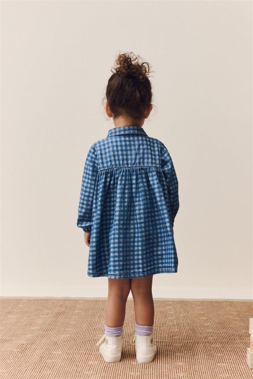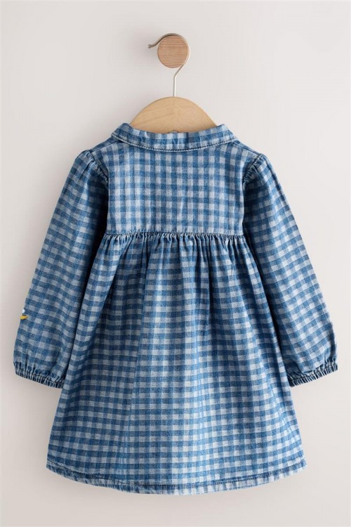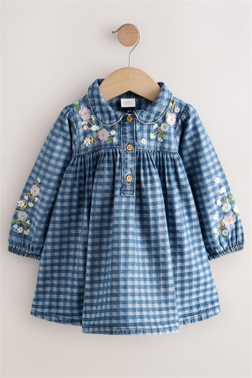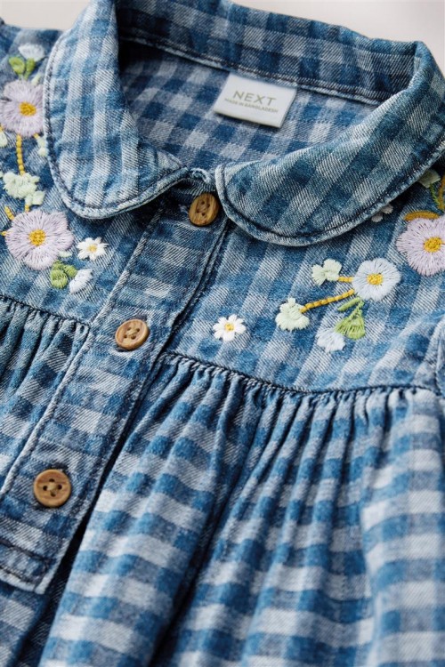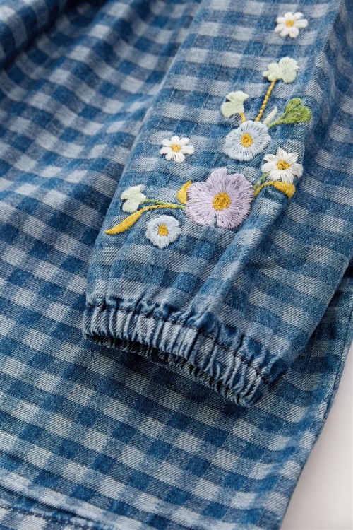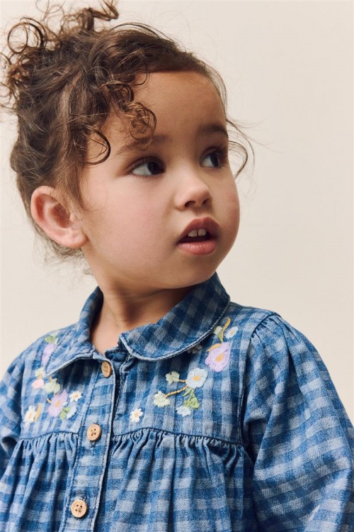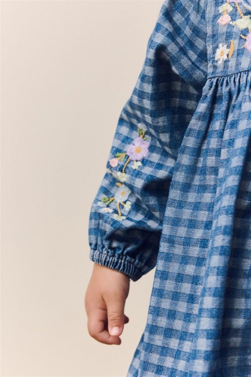 Очарователна рокля на синьо каре с нежна цветна бродерия по горната част и ръкавите. Изработена от мек и дишащ памук, тя е идеална както за ежедневието, така и за специални поводи. Дървените копчета добавят още чар