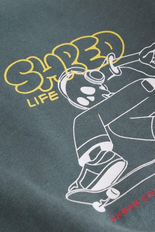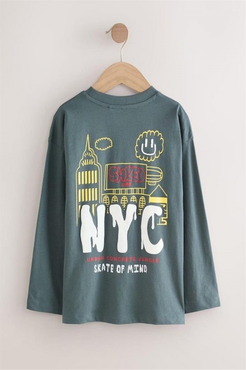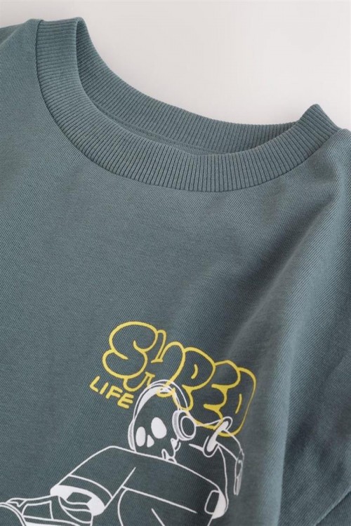 Готина блуза с дълъг ръкав в синьо-зелено с малка щампа отпред – скейтборд и надпис „SUPER COOL“. Изработена от мек и дишащ памук, подходяща за ежедневно носене.