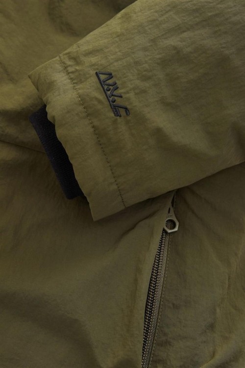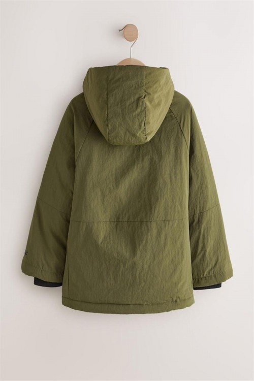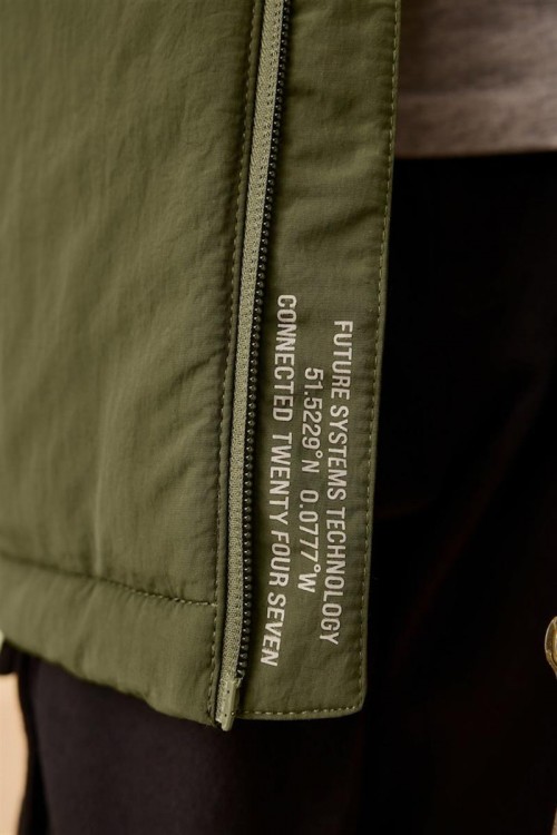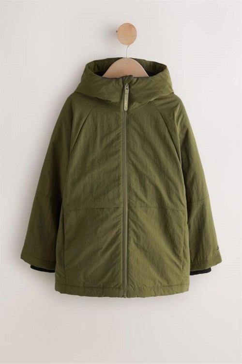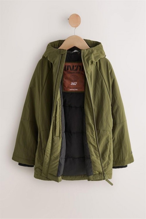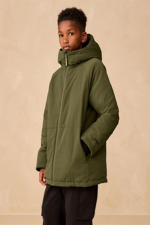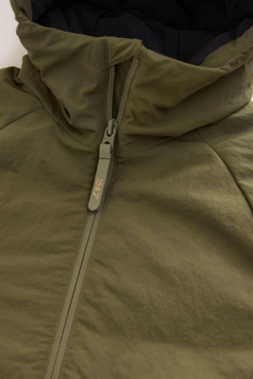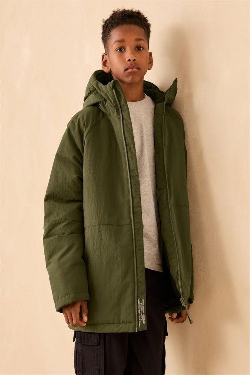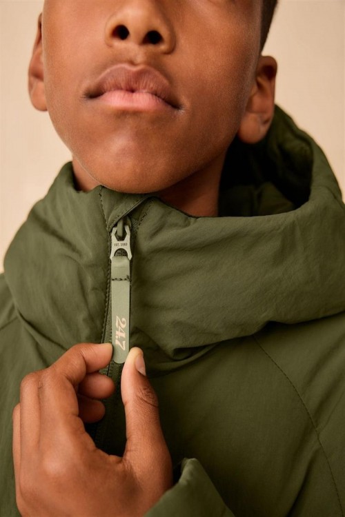 Стилно зимно яке в каки зелено с подвижна качулка и цип отпред. Осигурява топлина и удобство в студените дни. С модерен силует и практични странични джобове.