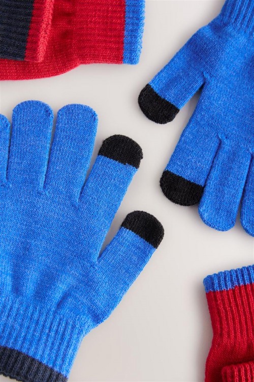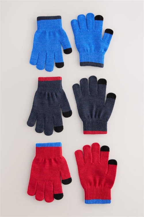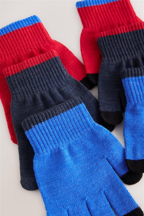 Комплект от 3 чифта плетени ръкавици в забавни цветове – ярко синьо, класическо тъмносиньо и наситено червено. Всяка двойка е с черни връхчета за модерен акцент. Меки, еластични и топли – идеални за студените дни.