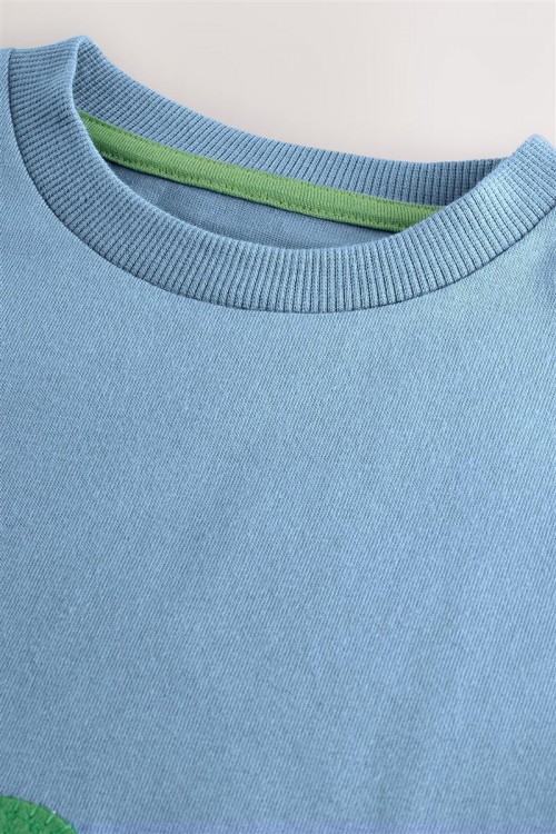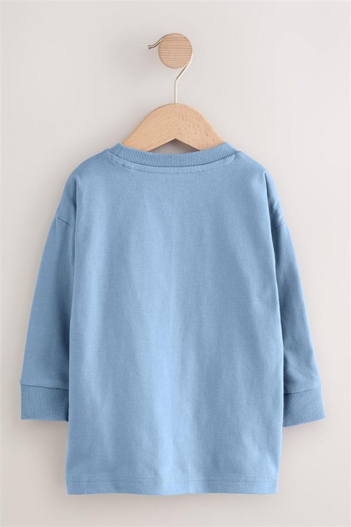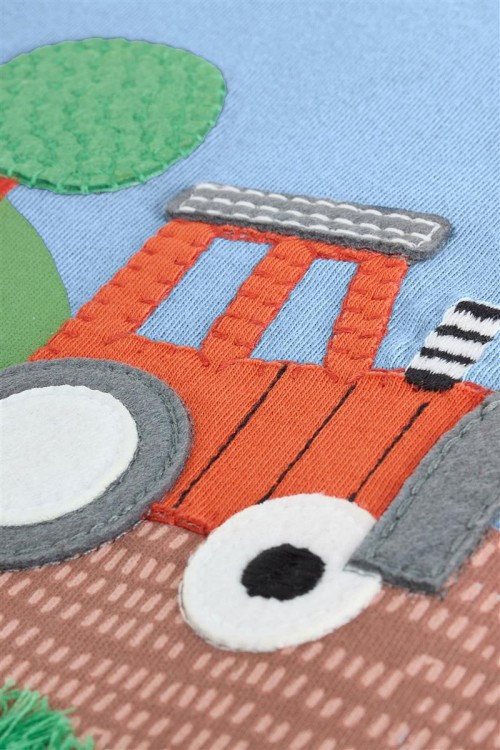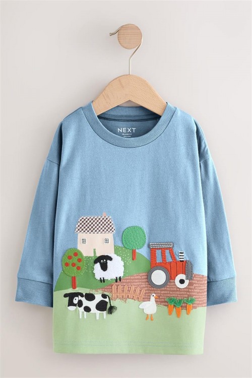 Очарователна блуза с дълъг ръкав в нежно синьо с пъстър дизайн на ферма. Изобразени са трактор, животни и градински детайли – забавен и игрив акцент за малките. Перфектна за ежедневието с весело селско излъчване