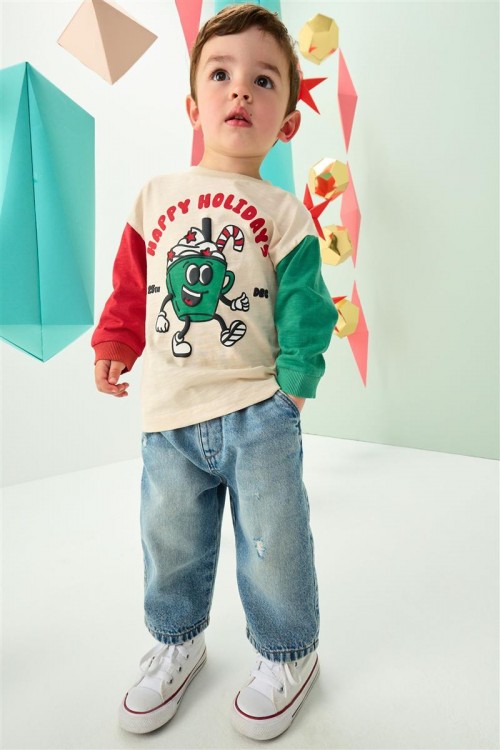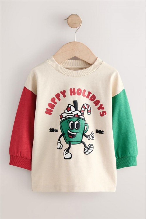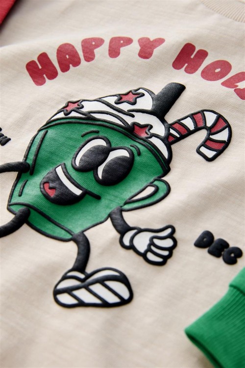 Весел коледен суитшърт с надпис „Happy Holidays“ и забавна анимационна щампа. Със зелени и червени ръкави за празнично излъчване, тази топла блуза е идеална за коледни тържества и зимни разходки.