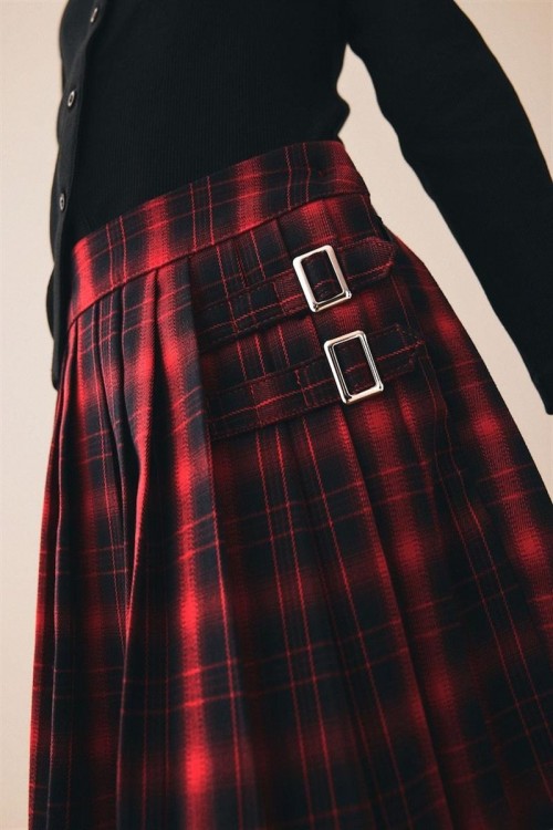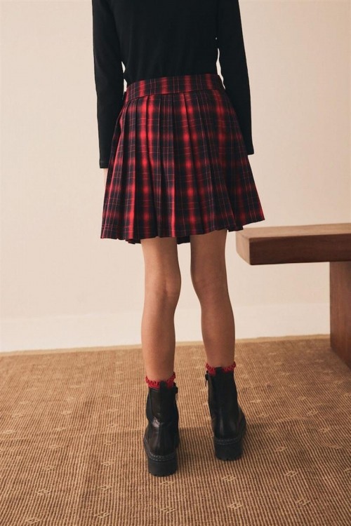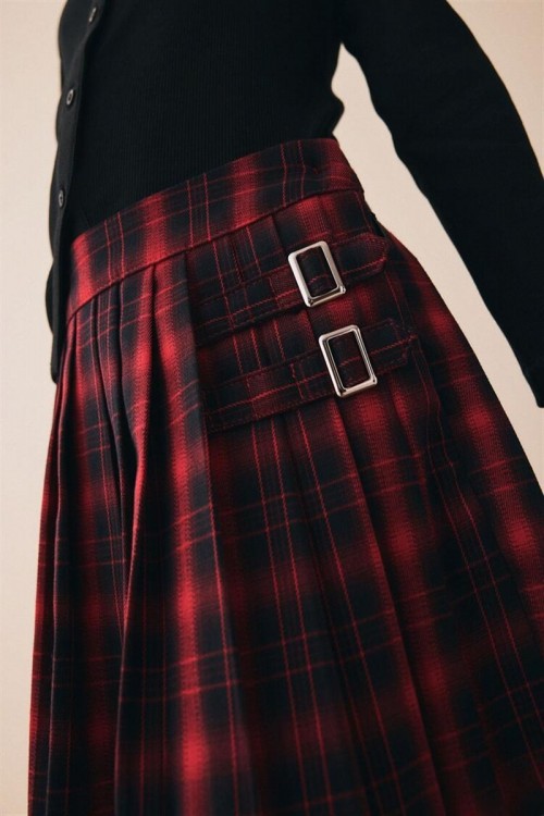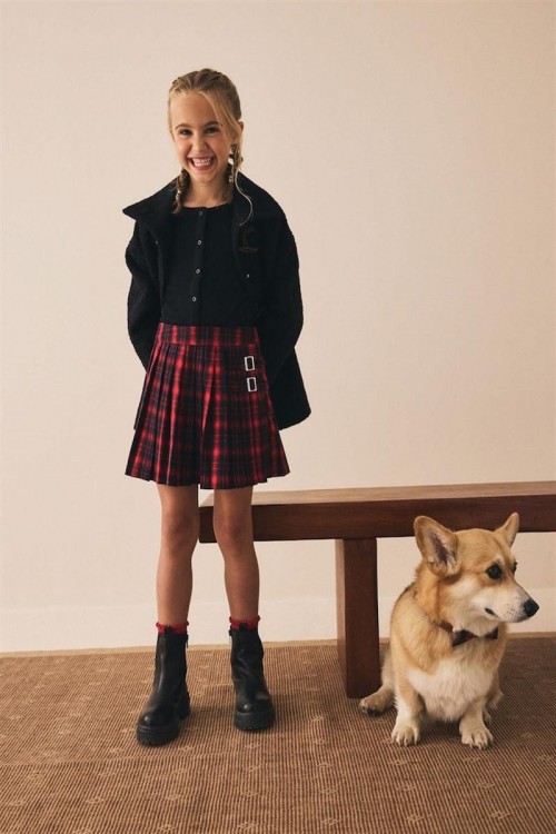 Стилна детска пола с червен тартан каре и плисета, допълнена с катарами отстрани за класическо, но модерно излъчване. Структурираните гънки придават обем и елегантност, което я прави идеална за училище, празнични поводи или ежедневни разходки.