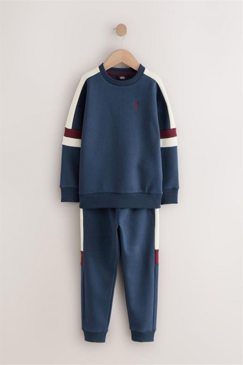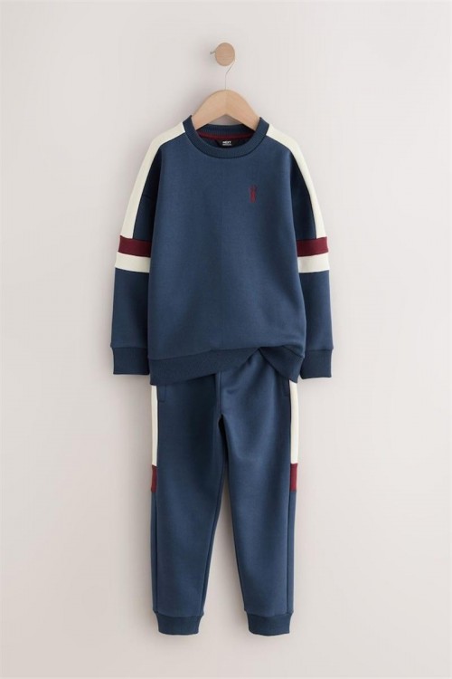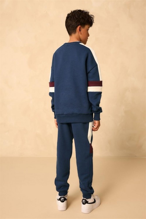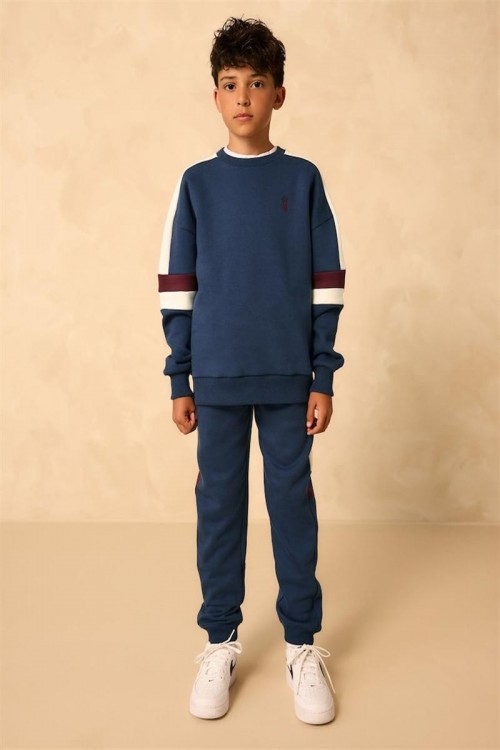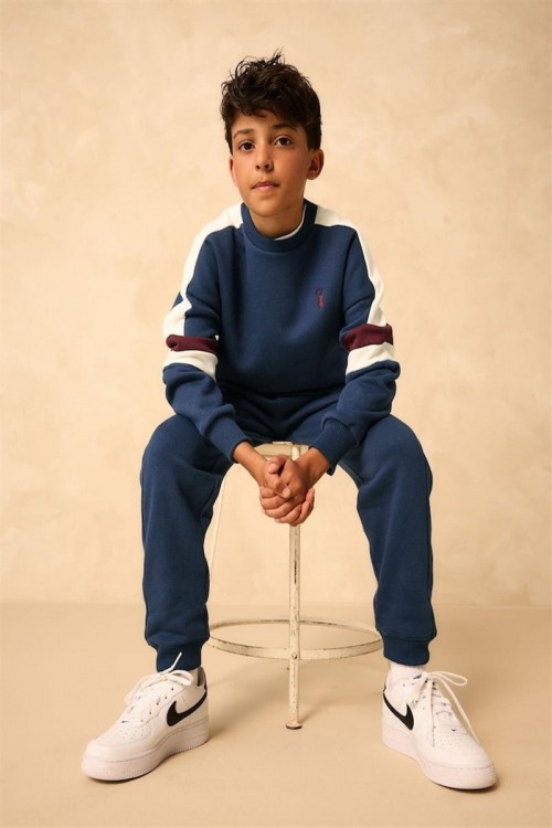 Спортен и стилен комплект анцуг в тъмносиньо с бели и бордо ивици по ръкавите и крачолите. Изработен от мек и удобен плат, подходящ за активни дни, спорт или ежедневно носене. Универсално облекло за всякакви приключения.