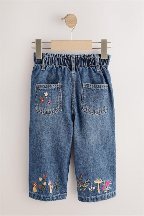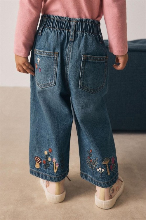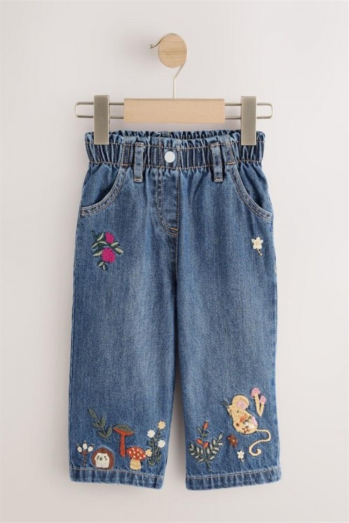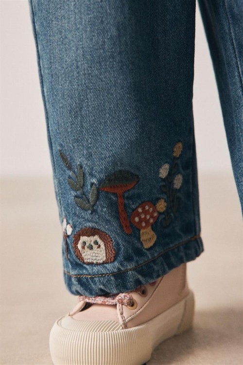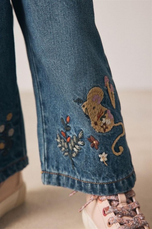Очарователни дънки с широка кройка и цветни бродерии на животни, цветя и забавни елементи. С удобна еластична талия за лесно обличане и комфорт. Игрив и стилен избор за ежедневни тоалети