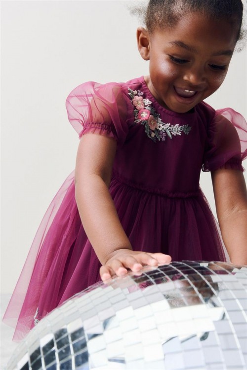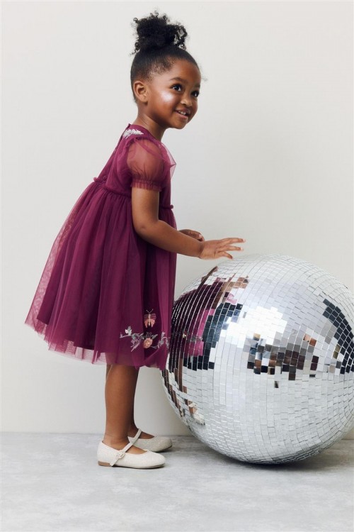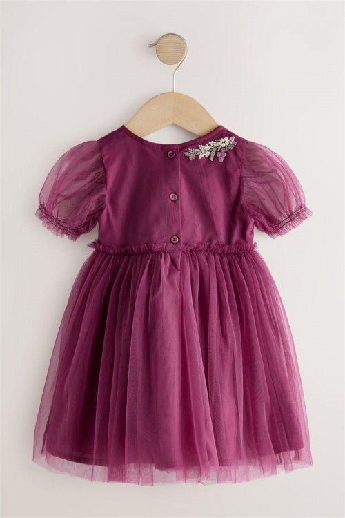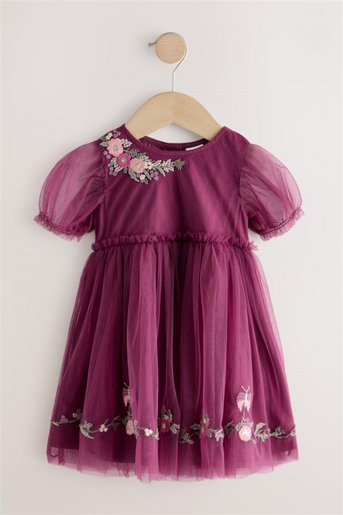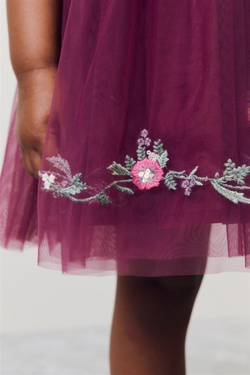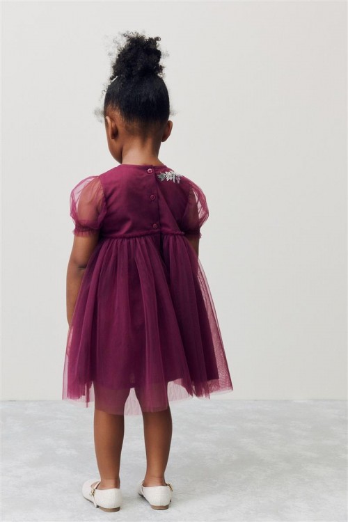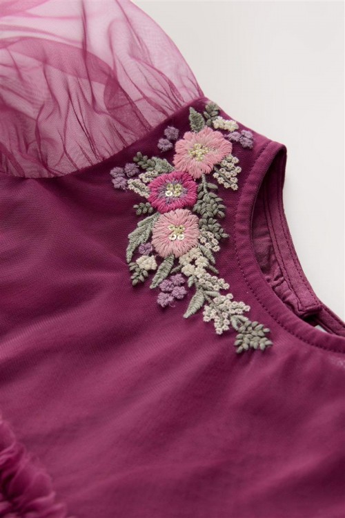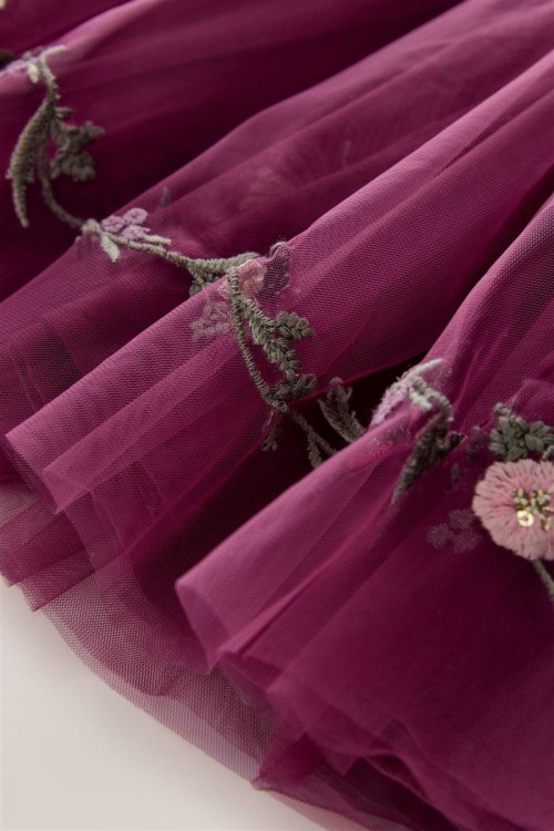 Тази очарователна рокля е идеална за сватби и специални поводи, с многопластова мрежеста конструкция с удобна памучна подплата, къси бухнали ръкави, флорална бродерия и закопчаване с копчета на гърба.