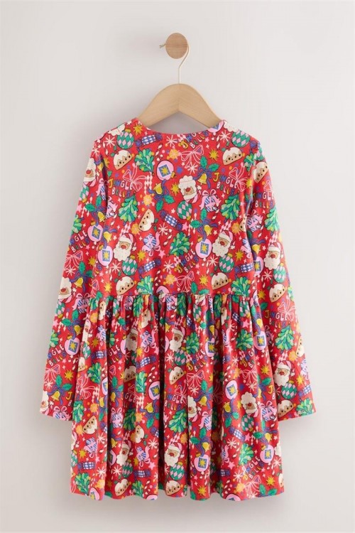 Ярка червена рокля с празничен флорален и коледен принт, с дълги ръкави и удобна кройка. Идеална за коледни партита, празнични снимки и семейни събирания