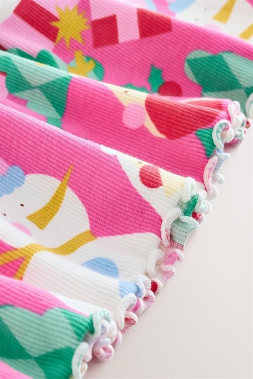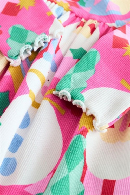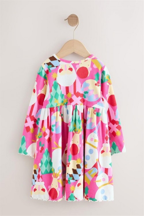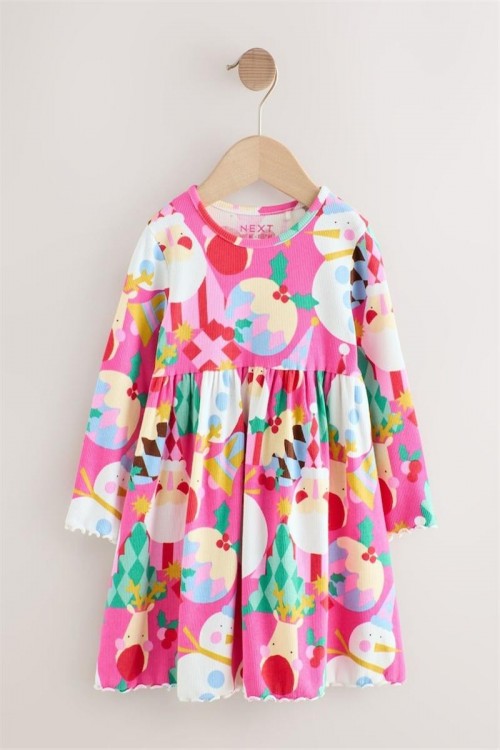 Яркорозова празнична рокля с весел коледен принт, включващ лица на Дядо Коледа, звезди и орнаменти. С дълги ръкави и закачлива кройка – идеална за празнични партита, коледни тържества и снимки.