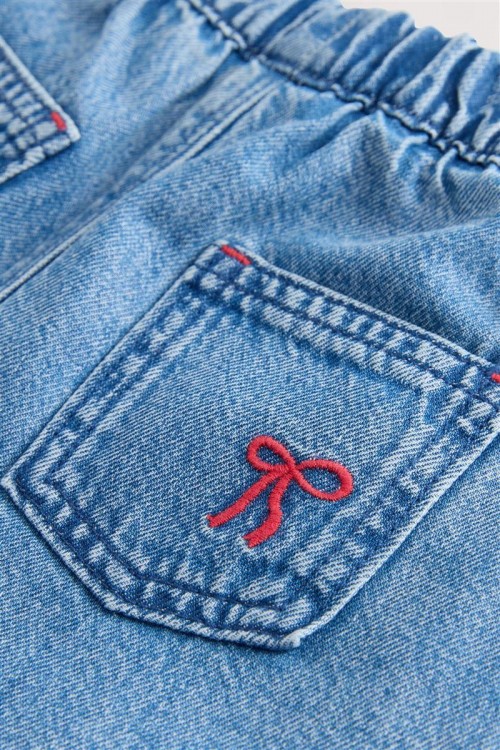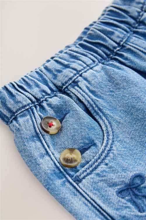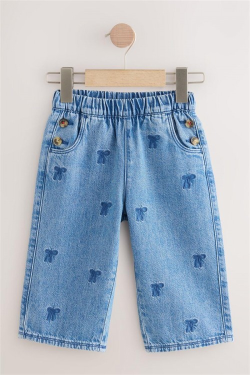 Тези модерни дънки са създадени с мисъл за удобство и стил. Изработени от здрав памучен деним, те имат ластична талия за лесно обличане и комфортно прилягане. Светлосиният цвят е украсен с фини бродирани пеперуди, които придават сладък и игрив акцент към класическия дизайн. Подходящи за ежедневието, тези дънки съчетават практичност и чар.