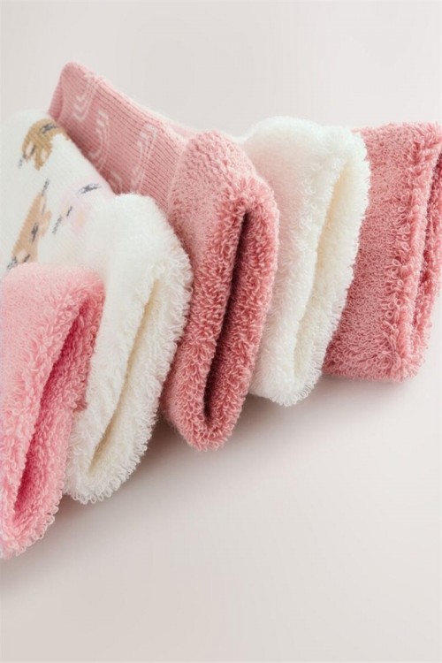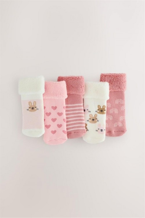 Този очарователен комплект от 5 чифта чорапки е създаден, за да поддържа малките крачета топли и уютни. Всеки чифт е с уникален дизайн – сладки животински лица, сърчица, райета и нежни пастелни шарки в розово и бяло. Изработени от мека и еластична материя, чорапките осигуряват комфорт и перфектно прилягане за ежедневието.