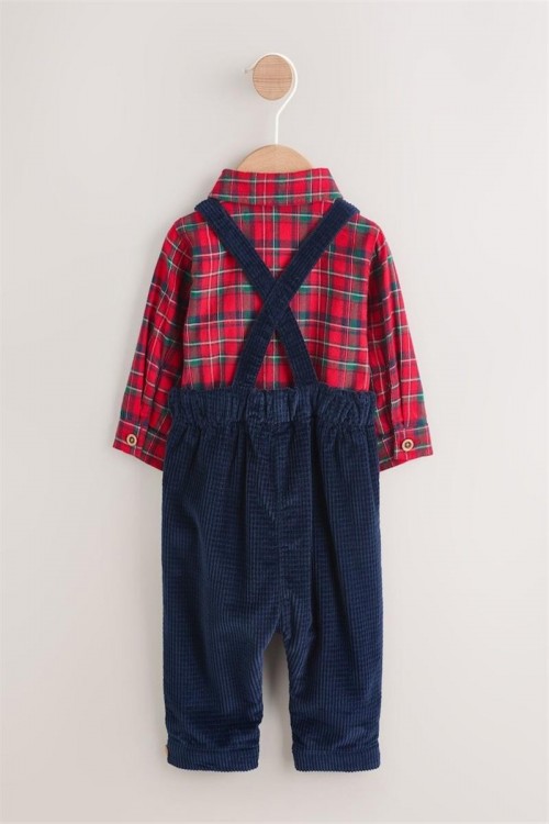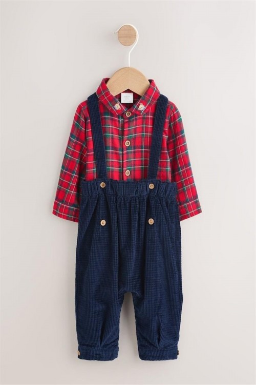 Очарователен комплект, подходящ за специални поводи или ежедневие. Състои се от риза с червено-зелено каре и копчета, комбинирана с меки панталонки от тъмносиньо кадифе с регулируеми тиранти и декоративни копчета. Създаден за комфорт и стил, комплектът е класически избор за да изглежда малкият ви господин едновременно уютно и елегантно.
