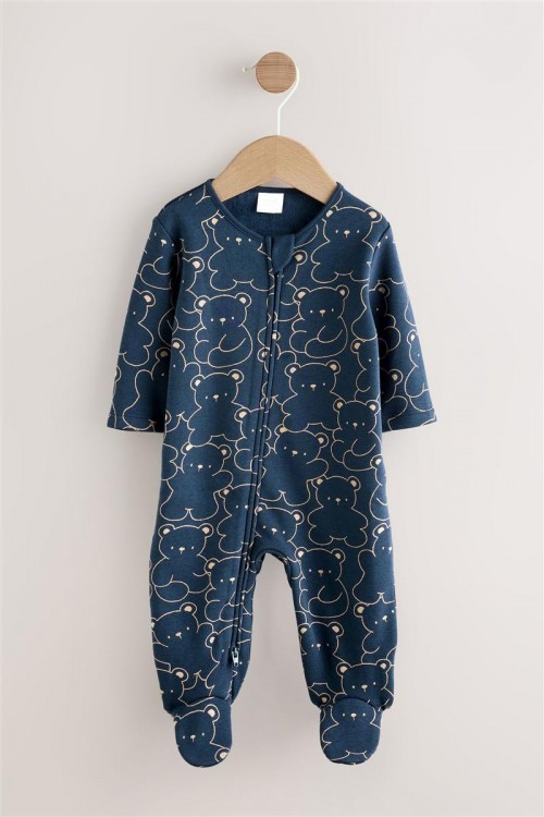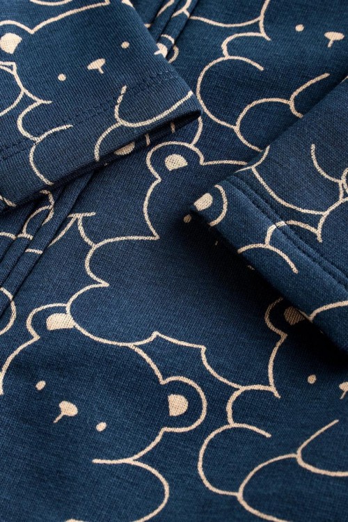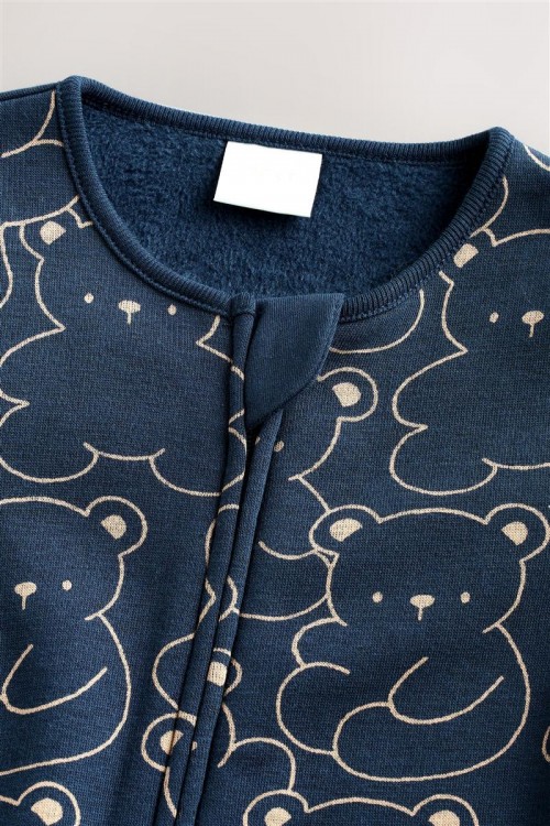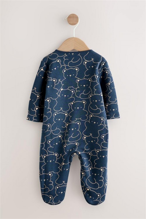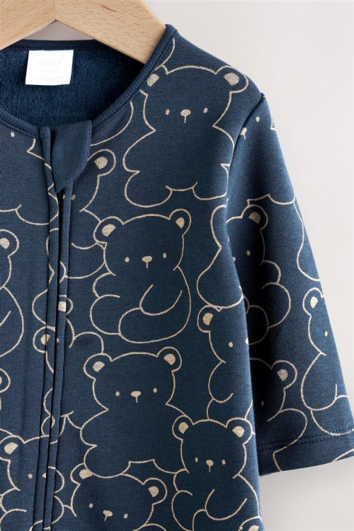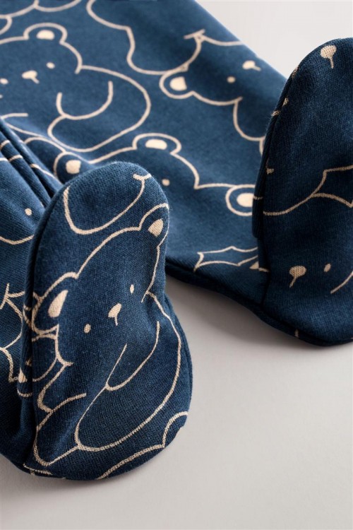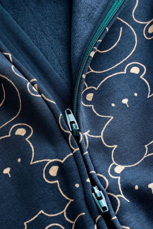 Очарователна бебешка пижамка в тъмносин цвят с щампа на сладки мечета – идеална за спокоен сън и уютни следобеди. Изработена от мека и дишаща памучна материя, която е нежна към бебешката кожа. Закопчаването с тик-так копчета отпред улеснява обличането, а вградените крачета поддържат малките пръстчета топли.