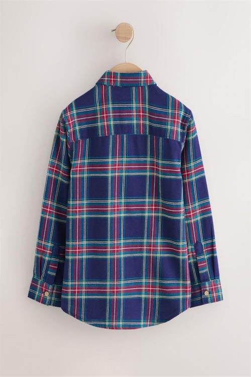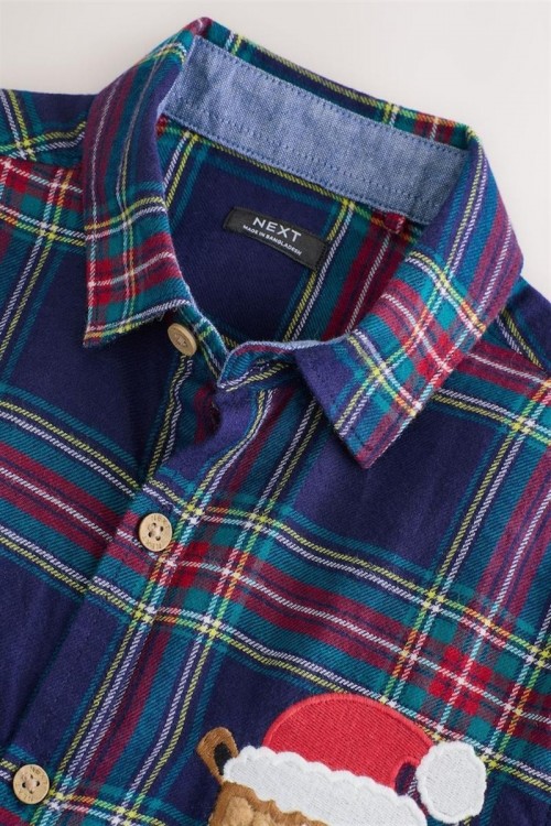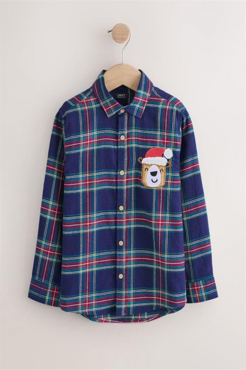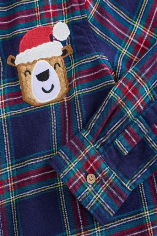 Тази празнична карирана риза е забавен и уютен избор за празничния сезон. Дизайнът ѝ е в класическо тъмносиньо, зелено и червено каре, а на джоба на гърдите ѝ е изобразено игриво бродирано мече с шапка на Дядо Коледа. Изработена от мек памучен плат, тя е нежна към кожата и е идеална за носене върху тениска или под пуловер. Идеална е за коледни събирания или ежедневно зимно носене.