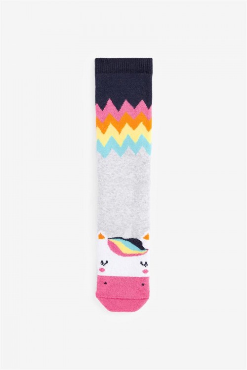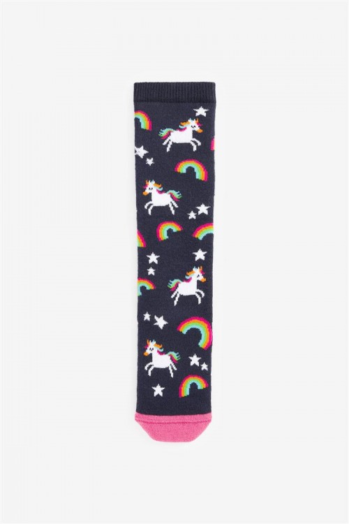 Продават се в комплект от 2 броя, тези забавни тъмносини чорапи имат прекрасни детайли с еднорог и акценти в цветни блокове. Изработени от термо материя с дебела памучна хавлиена основа за топлина и Bi-ome обработка, за да поддържат краката свежи за по-дълго време.