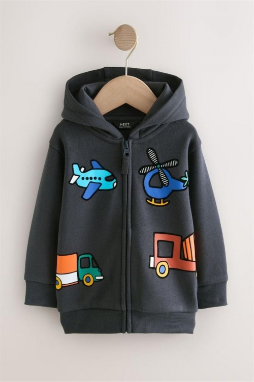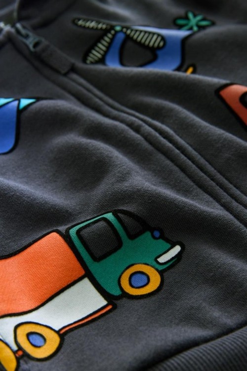 Вашият малък приятел ще хареса този суитшърт с качулка от памучен трикотаж, с цип по цялата дължина, вградена качулка и спуснати рамене, завършен с двойни странични джобове и забавни апликации.