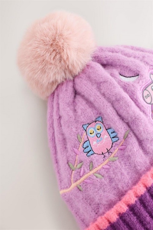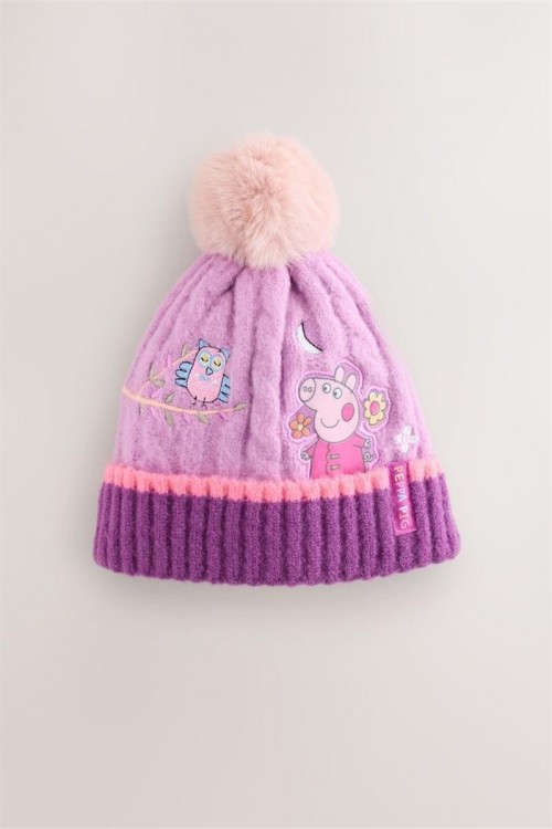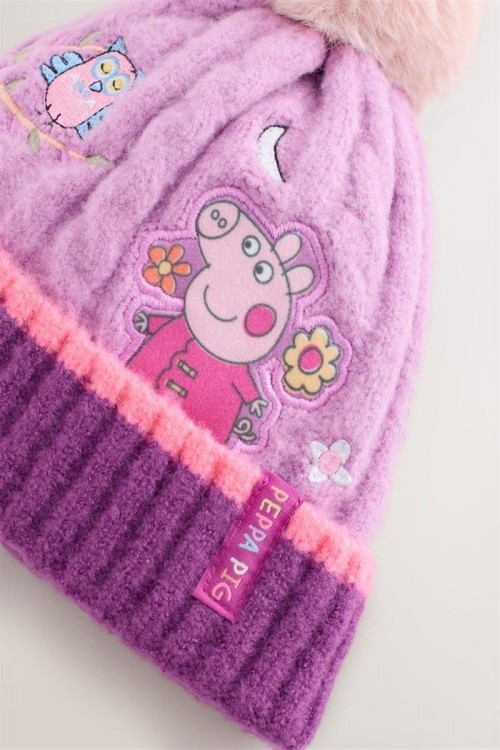 Поддържайте вашето дете топло и усмихнато с тази сладка плетена шапка Peppa Pig. С красива бродерия на Пепа и нейната приятелка совата, шапката е в нежни розови и лилави нюанси и е завършена с пухкав помпон отгоре. Изработена от мек и топъл плетен плат, тя осигурява комфорт през студените дни и добавя игрив акцент към всяка зимна визия.