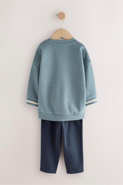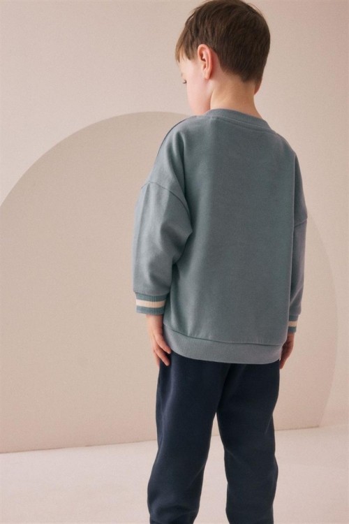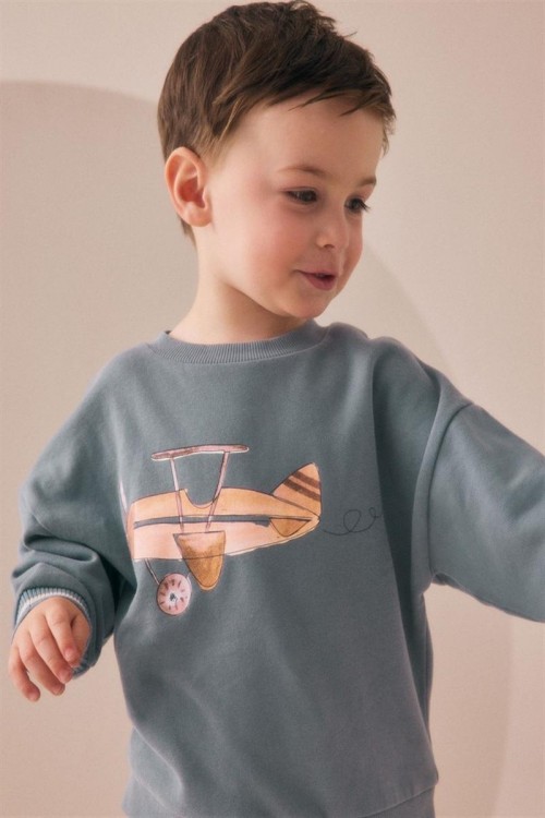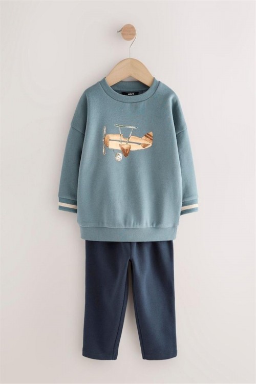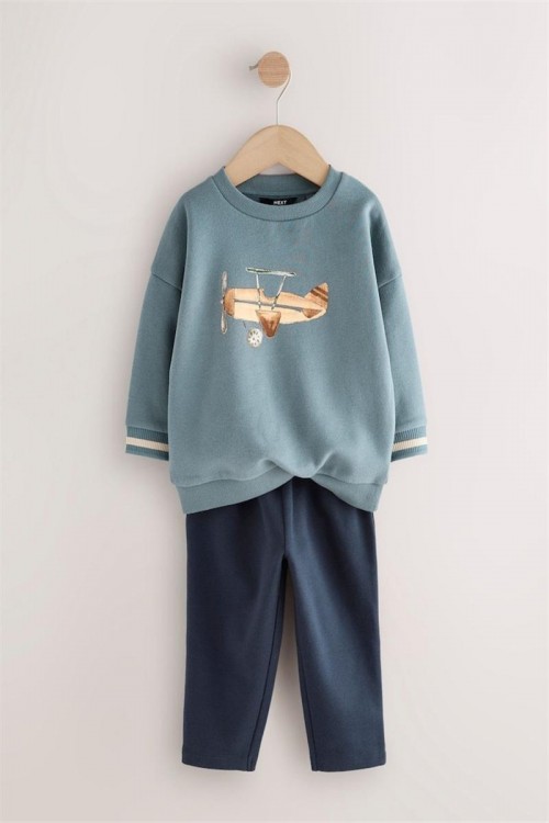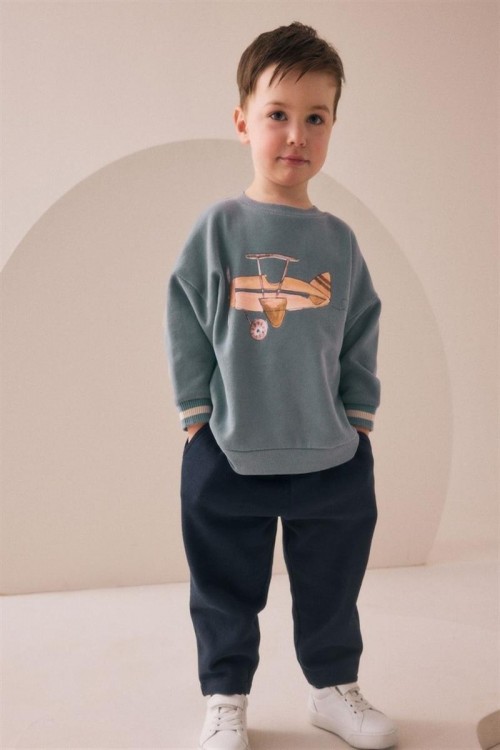 Този очарователен комплект съчетава удобство и игрив стил. Суитшъртът е в мек зелен нюанс със забавен принт на самолет и цветни райета по ръкавите. Комбиниран е с тъмносини долнища с еластичен колан и маншети, идеални за активни дни или уютни моменти у дома. Завършен с бели кецове, комплектът създава стилна ежедневна визия за малки откриватели.