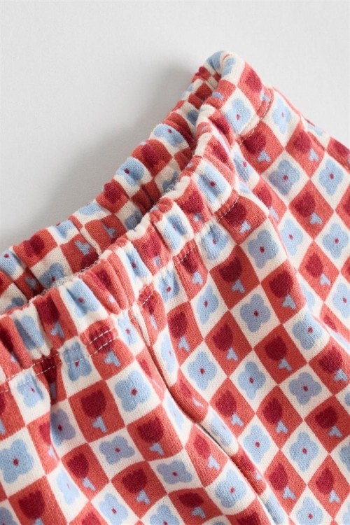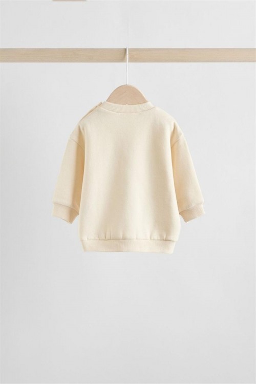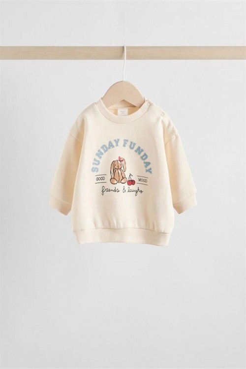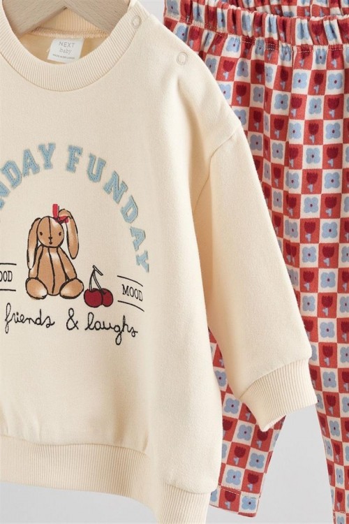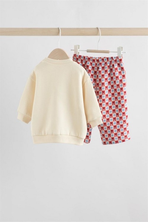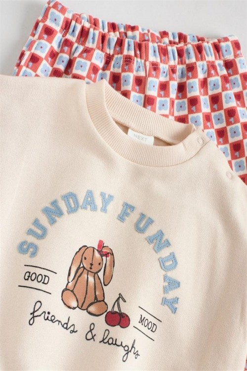 Очарователен бебешки комплект, включващ мек суитшърт в кремаво с надпис „Sunday Funday“ и сладка щампа с меченце, съчетан с панталон на червено-бели квадратчета. Изработен от мека и дишаща памучна материя, той осигурява комфорт и топлина през целия ден. Суитшъртът е с удобна свободна кройка и ластични маншети, а панталонът има еластичен колан за лесно обличане и свобода на движение. Идеален избор за уютни уикенди и игриви дни у дома.