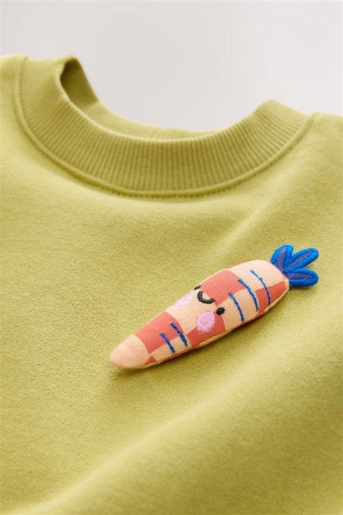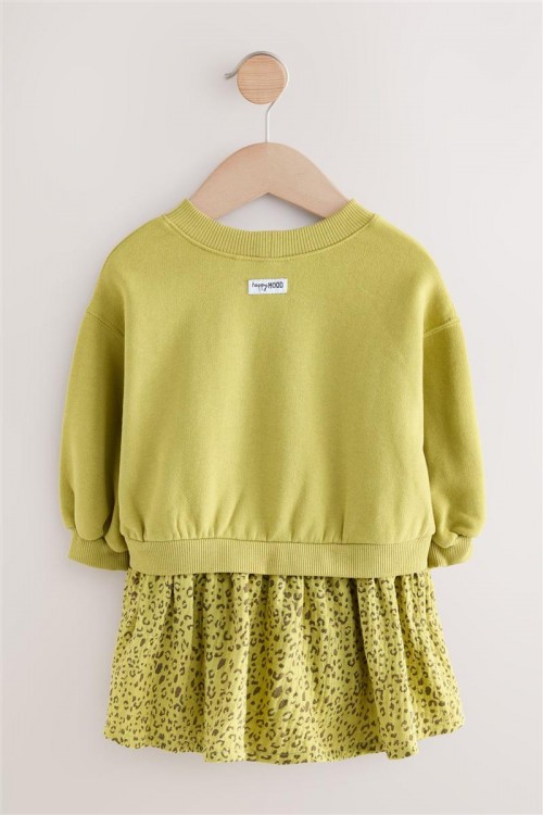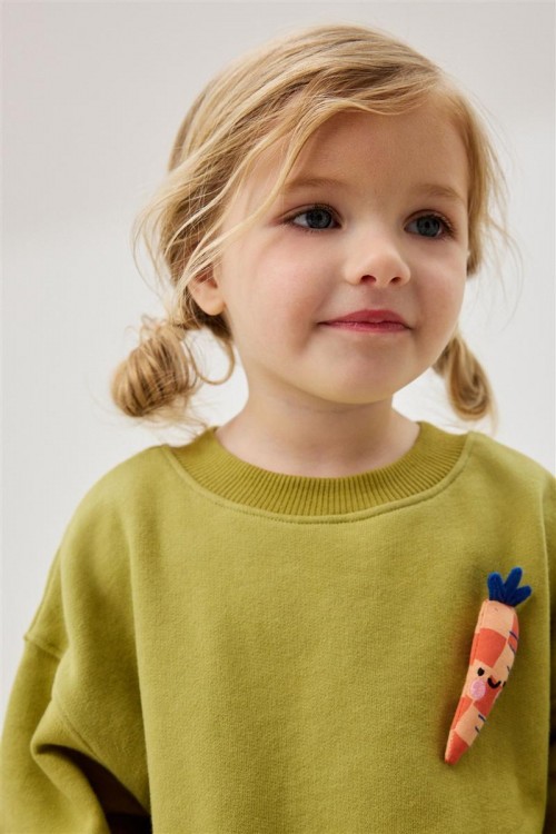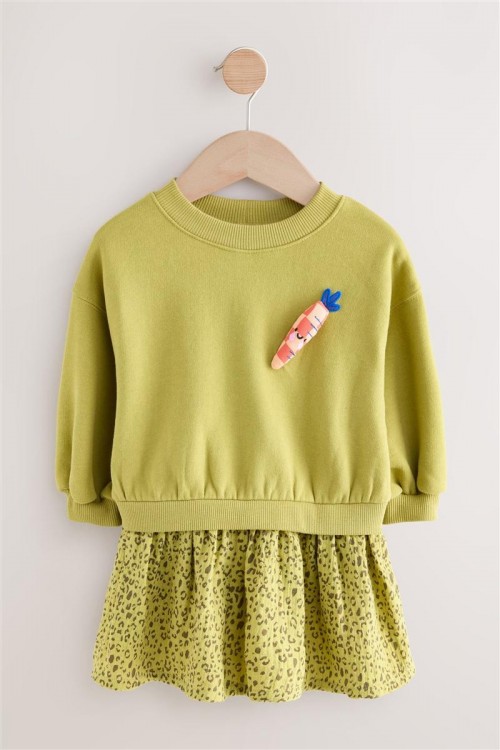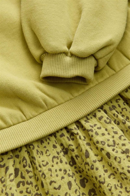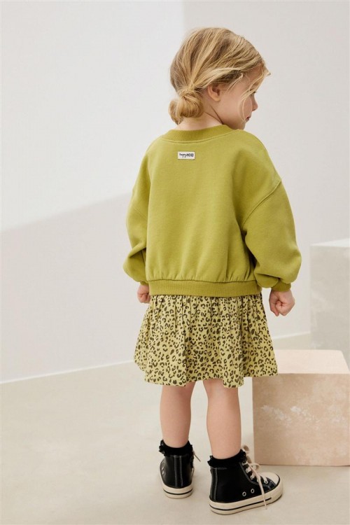 Забавна и удобна рокля в зелено, която съчетава стил и комфорт. Горната част е изработена от мек суитшърт плат и е украсена с 3Д детайл – морковче, което придава игрив акцент. Полата е разкроена и с фин животински принт, добавящ чар и динамика. Изработена от мек памук, роклята е чудесен избор за ежедневието, игри или разходки.