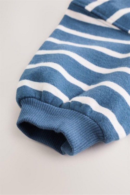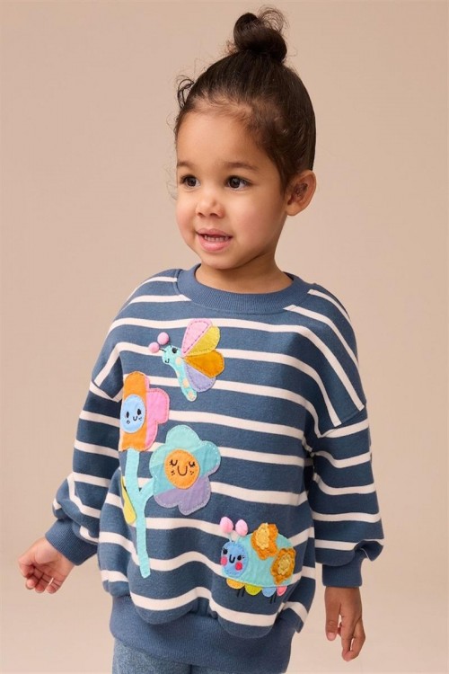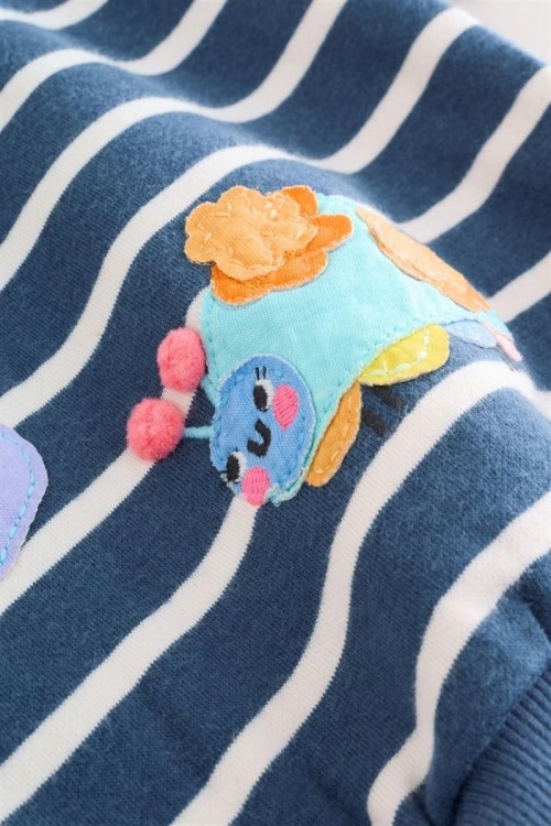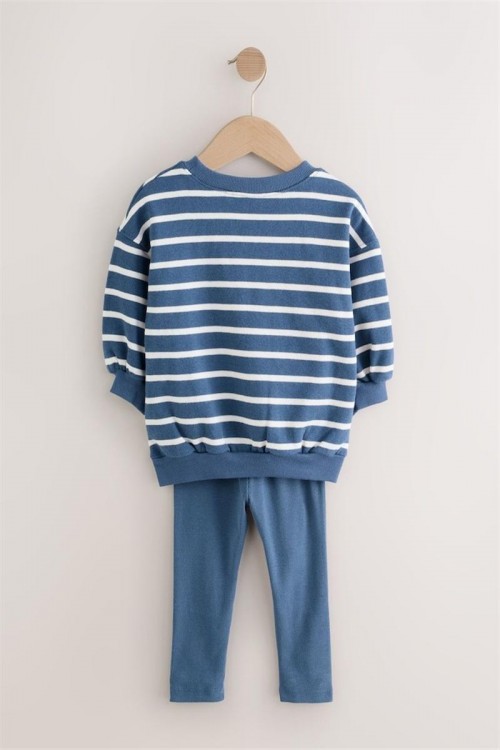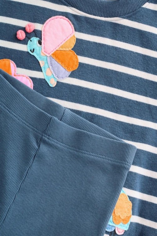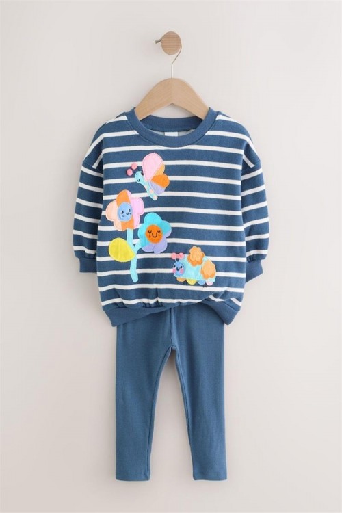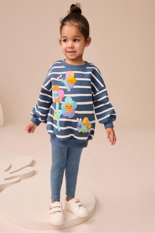 Очарователен комплект, включващ синьо-бял раиран суитшърт с весели апликации на усмихнати цветя и слънце. Мекият и еластичен клин в същия нюанс осигурява удобство и свобода на движение, идеален за активните малчугани. Изработен от приятна на допир памучна материя, този комплект е чудесен избор за игри, разходки и ежедневие – съчетава комфорт и забавен стил.