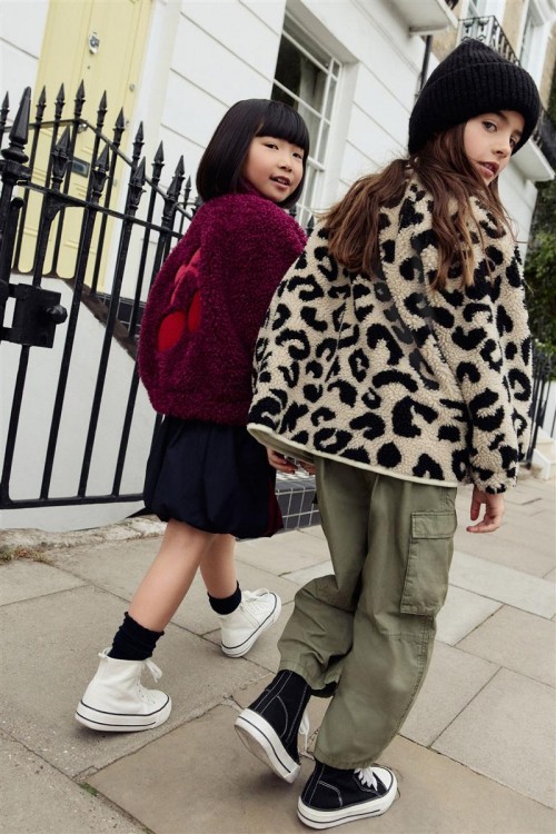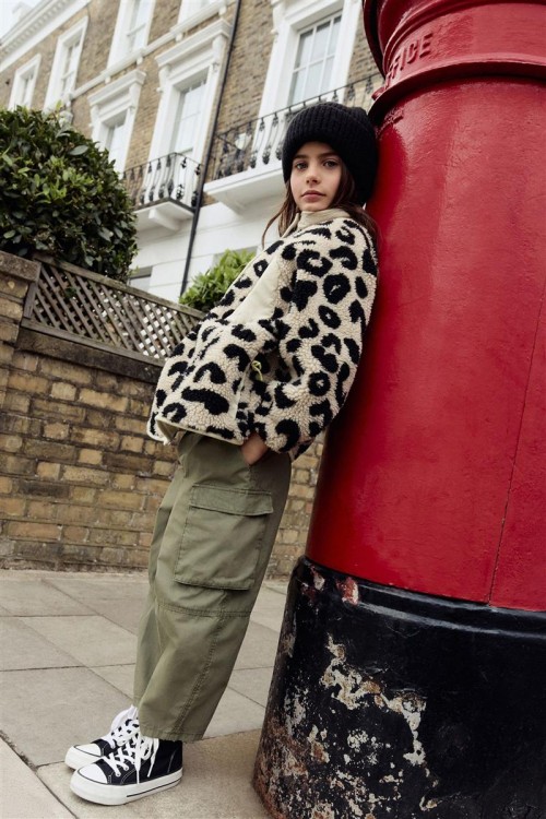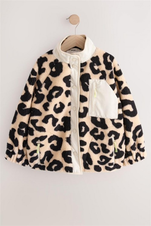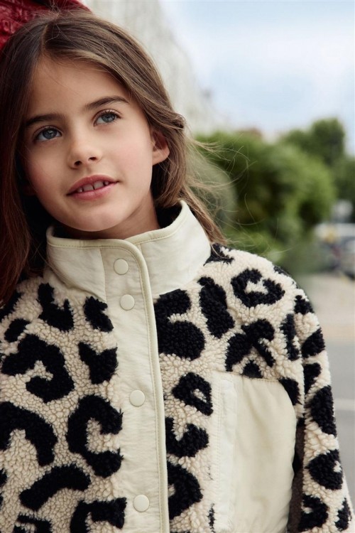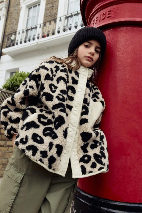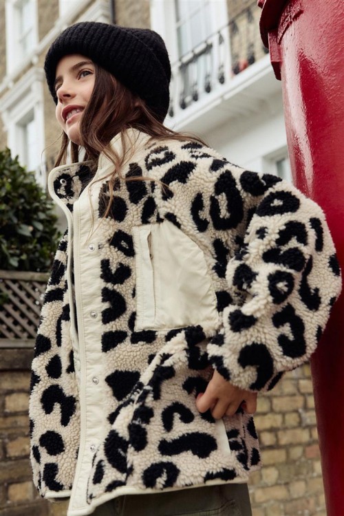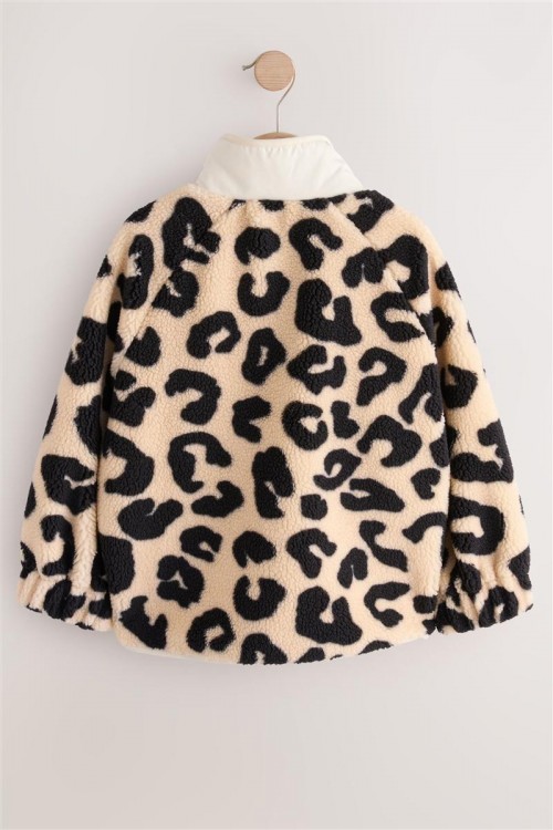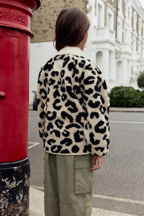 Модерно яке от полар с ефектен леопардов принт в черно и бежово – перфектно съчетание на топлина и стил. Изработено е с пухкава текстура и кремав панел с цип за контрастен акцент.