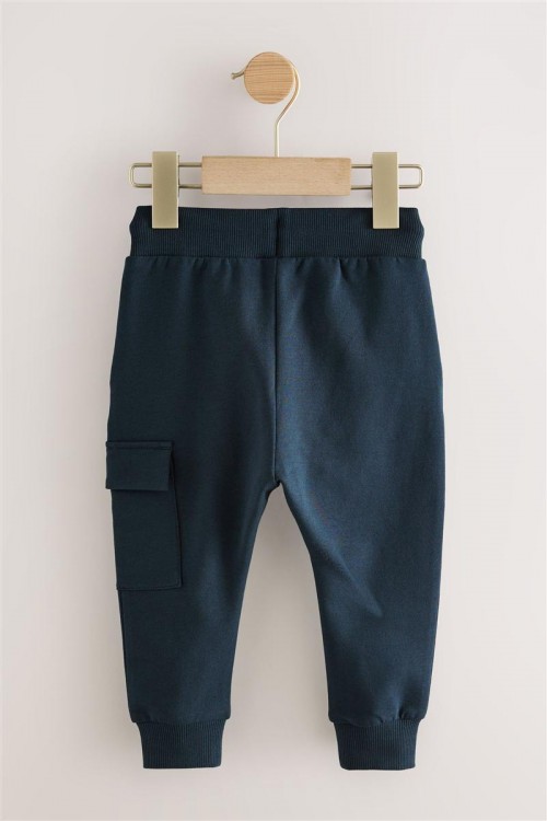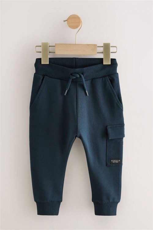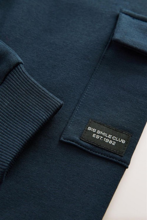 Удобни и стилни тъмносини спортни панталони, изработени от мек памучен плат. С еластична талия с връзки за регулиране, странични джобове и допълнителен карго джоб на единия крачол. Маншетите в долната част осигуряват приятно прилягане – подходящи за игри, разходки или ежедневна употреба.