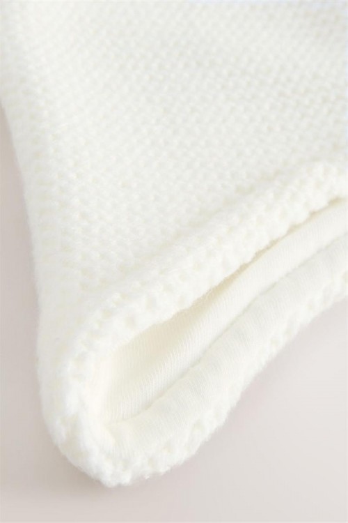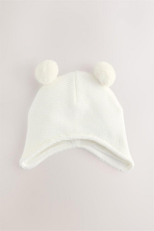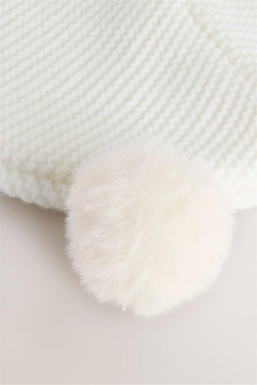 Очарователна бяла плетена шапка с два пухкави помпона отгоре, които ѝ придават вид на мечешки ушички. Моделът е с удължени краища за покриване на ушите и осигурява допълнителна топлина и комфорт през студените зимни дни. Изработена от мека, уютна прежда, тази шапка комбинира стил и практичност – перфектна за зимните разходки на вашето дете.