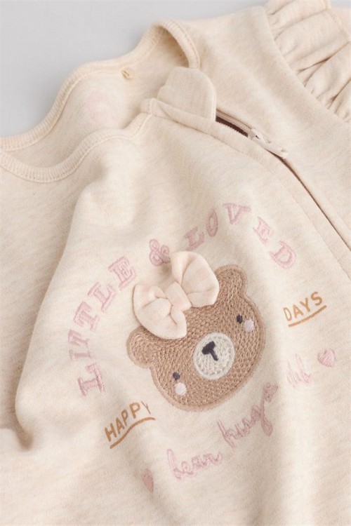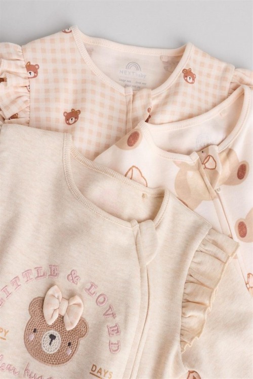 Комплект от 3 неутрални пижамки с мечета. Супер меката памучна материя е нежна към кожата им, а двупосочното закопчаване с цип прави обличането и смяната на пелените бързо и лесно. С комбинация от очарователни дизайни с мечета и едноцветни опции, тези пижамки са завършени с подплатени вътрешни крачета и ръкавици против драскане с обръщане назад до 3-6 месеца.