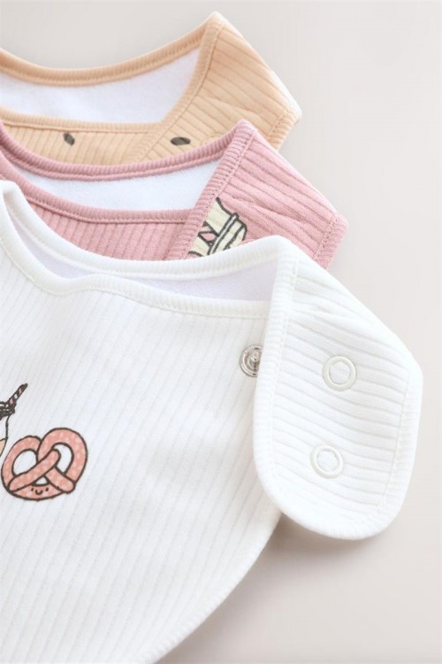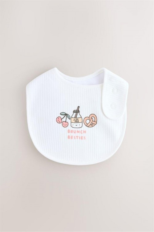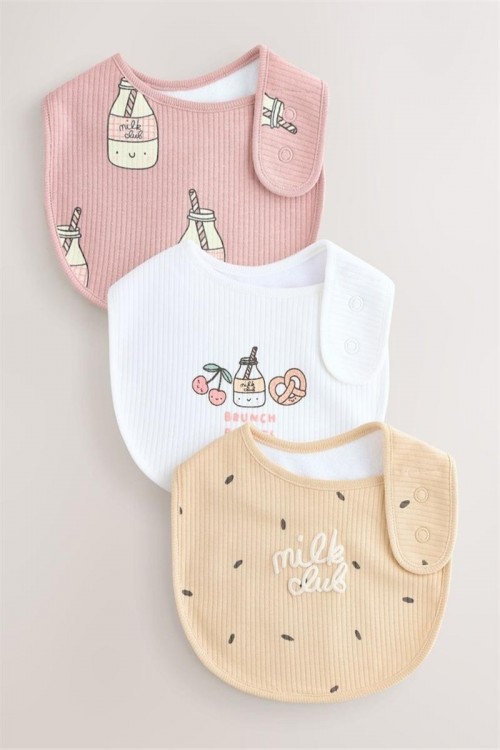Очарователен и практичен комплект от три лигавника в пастелни нюанси – розов, бял и бежов. Всеки лигавник е с весели щампи на бутилки, гевреци, черешки и надписи като „milk club“ и „brunch time“. Изработени от мек и попивателен памук с копчета за лесно закопчаване. Идеални за хранене или защита от слюнка с фин стил.