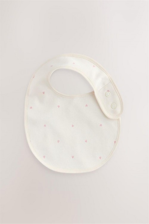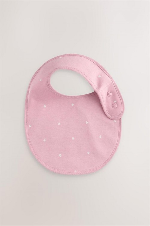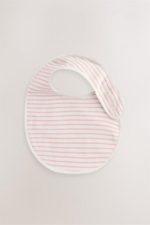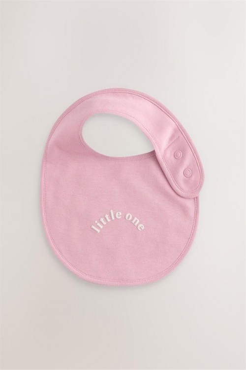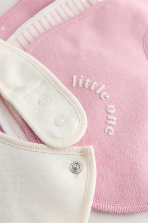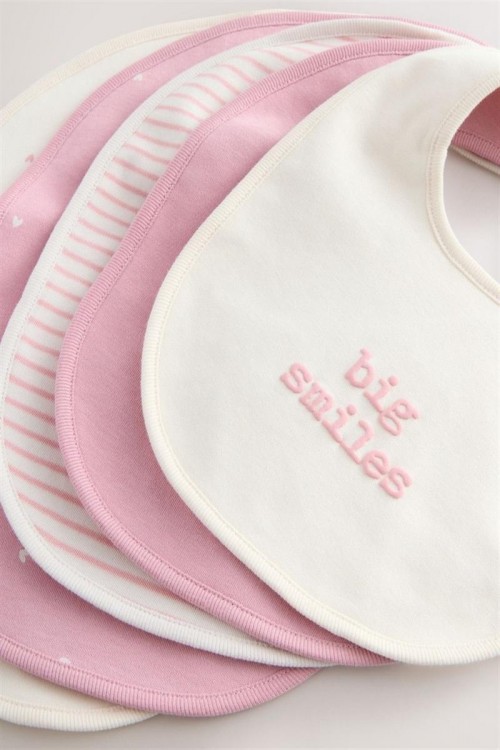 Очарователен комплект от пет меки памучни лигавника в розови и бели тонове. Всеки лигавник е с различен дизайн – райе, точки и бродирани надписи като „little one“ и „big smiles“. С удобни странични копчета за лесно закопчаване и сваляне. Идеални за хранене и защита на дрехите с фин и нежен стил.