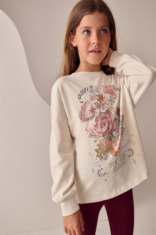 Очарователна блуза в нежен цвят екрю с флорален принт в розови и лилави нюанси, допълнен с деликатни звездни детайли и надпис „Full of Magic“. С дълги ръкави и свободна кройка, изработена от мек памучен плат за максимален комфорт през целия ден. Перфектен за ежедневие в комбинация с дънки или клин.