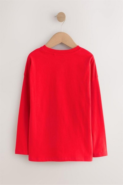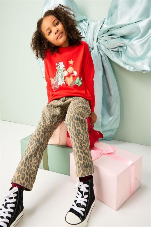 Празнична червена блуза с весела щампа на животни в коледни костюми под златна звезда. Изработена от мек памук, той осигурява топлина и комфорт през зимните дни.
