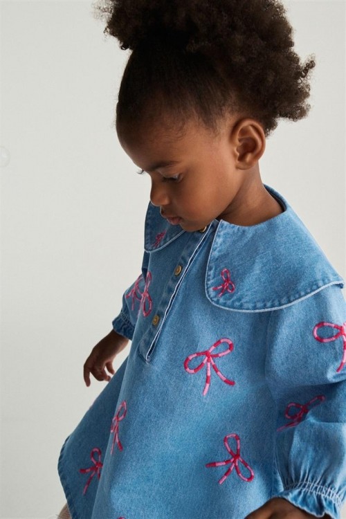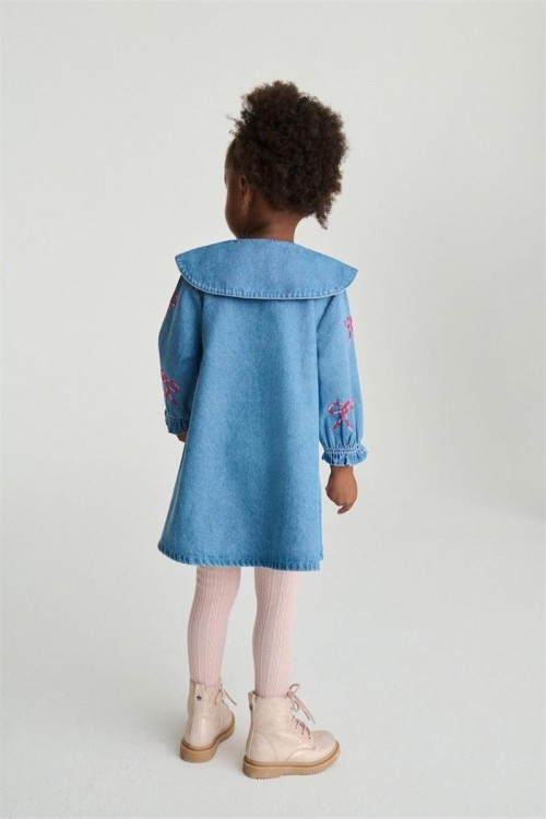 Очарователна дънкова рокля с розова флорална бродерия, която придава нежен и сладък акцент. С дълги бухнали ръкави, воланчета на маншетите и голяма яка тип „Питър Пан“ , моделът съчетава комфорт и стил.