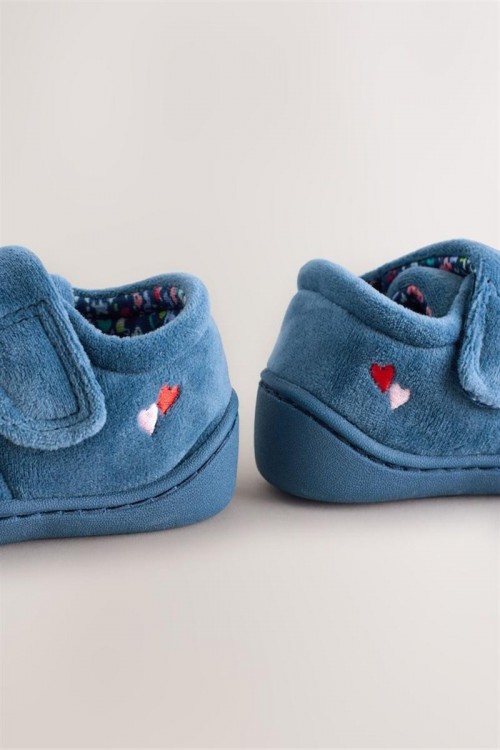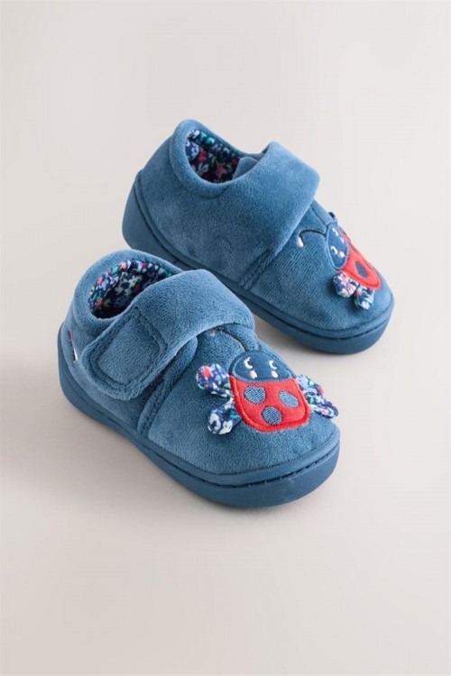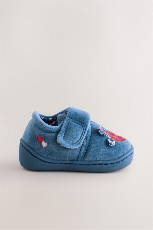 Меки и уютни сини пантофи с очарователна бродерия на калинка отпред за забавен и игрив вид. Изработени от плюшена материя, те поддържат детските крачета топли и удобни през целия ден. Пантофите са с удобна велкро лепенка за лесно обуване и стабилна подметка против плъзгане – идеални за домашни игри и комфорт.