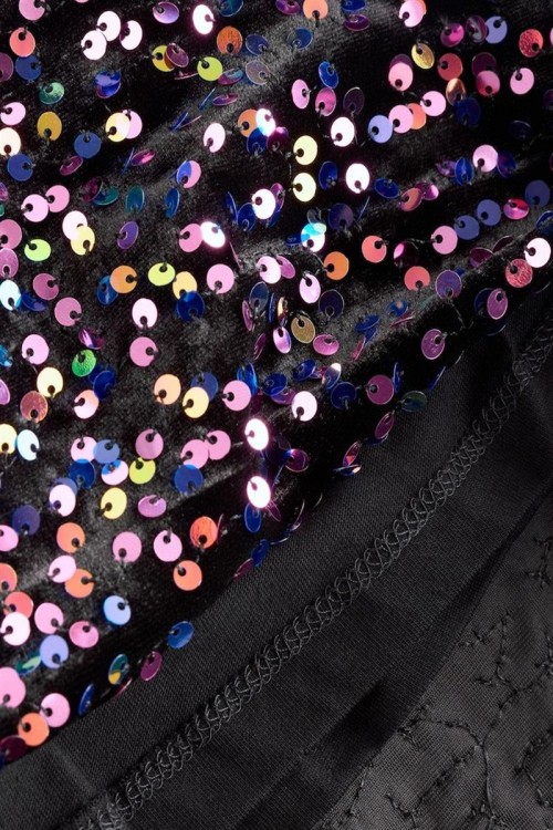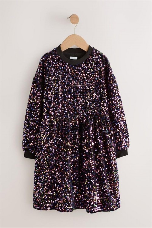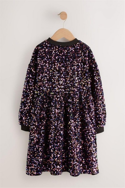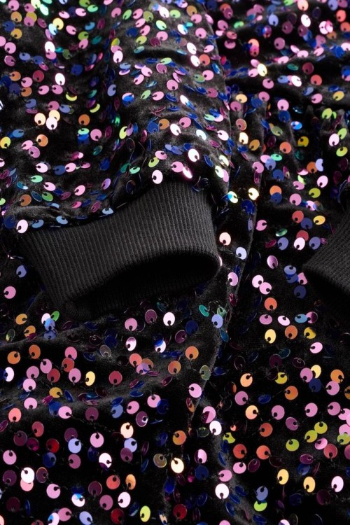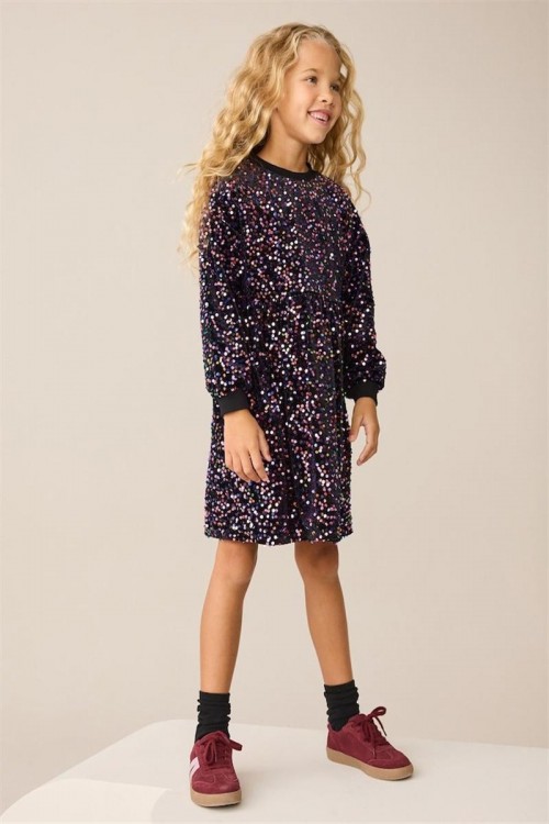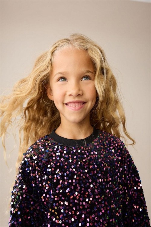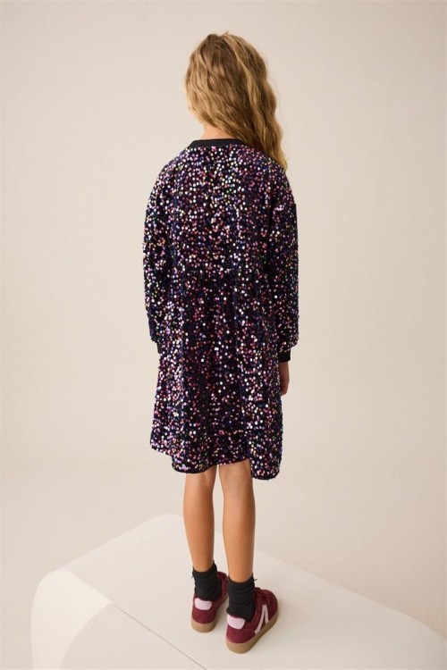 Впечатляваща черна рокля, обсипана с цветни пайети за блестящ и празничен вид – идеална за партита и специални събития. Моделът е с дълги ръкави, набрана талия и меки ластични маншети за удобство. С вътрешна подплата от приятна материя, която осигурява комфорт, докато детето ви сияе на всяко тържество.