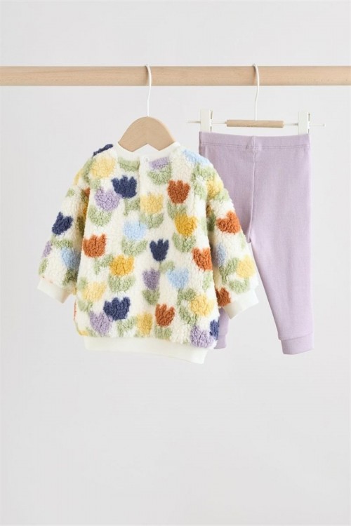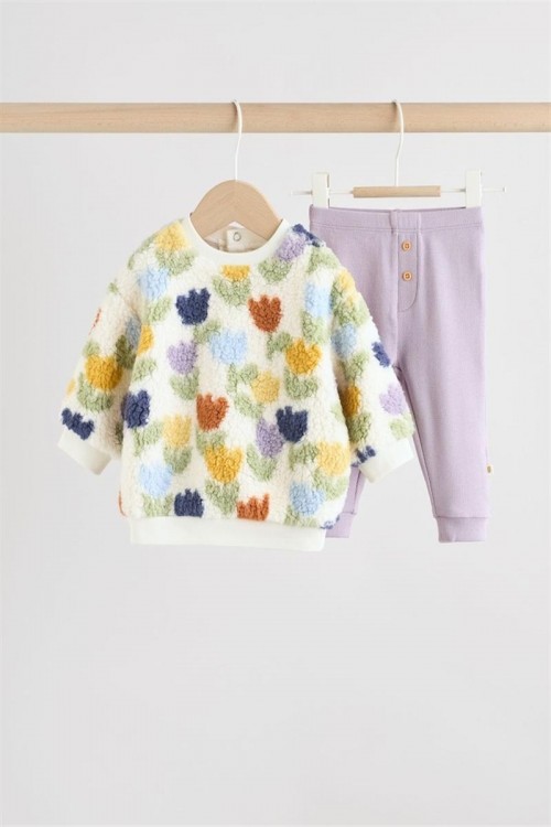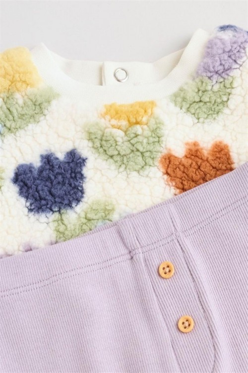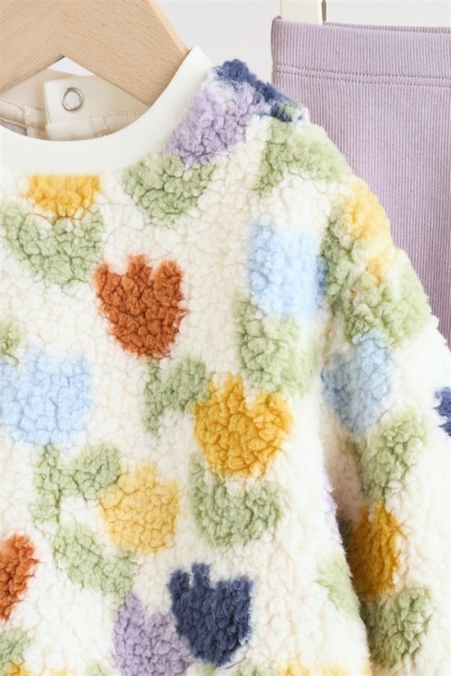 Очарователен бебешки комплект, включващ пухкав суитшърт с цветни лалета и клин в люляков цвят. Суитшърът осигурява топлина и сладък външен вид, а еластичният клин предлага удобство и свобода на движение. Изработен от мека и дишаща материя, комплектът е идеален както за ежедневие, така и за специални поводи — уютен, нежен и стилен избор за всяко дете.