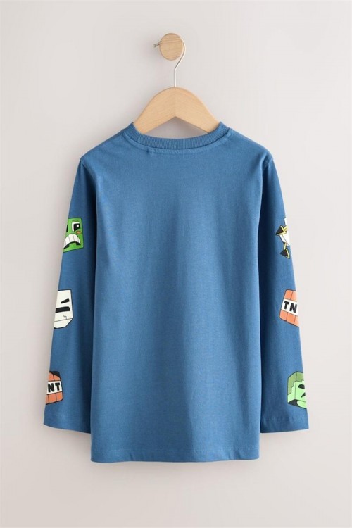 Забавна блуза с дълъг ръкав в син цвят с графики от популярната игра Minecraft – включително герои и надпис „Beware of the Bolt“ отпред. Ръкавите са украсени с цветни елементи от играта, а в долната част има малък етикет с логото „Minecraft“. Изработена от мек памук за комфорт през целия ден – идеална за малки почитатели на Minecraft.