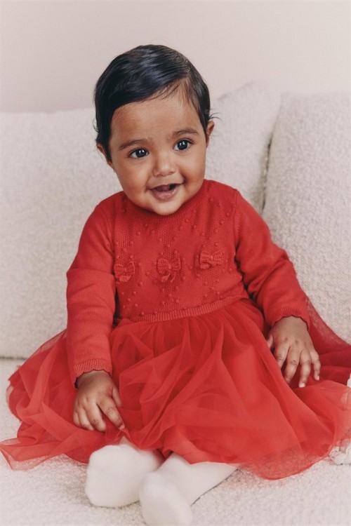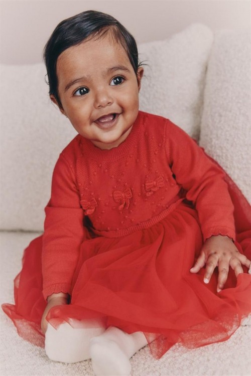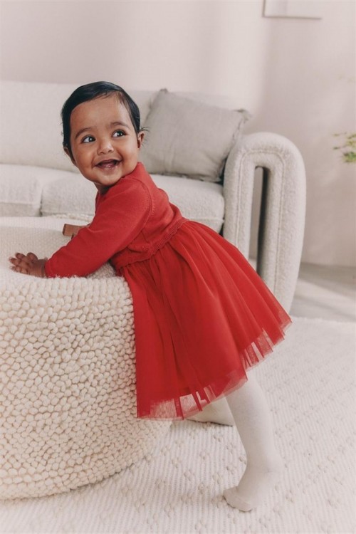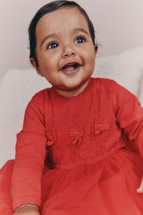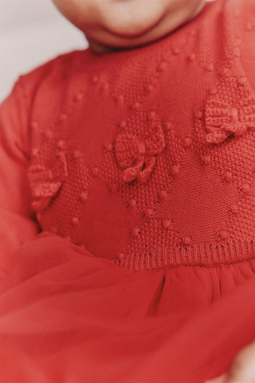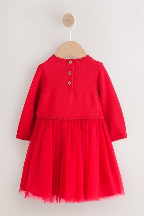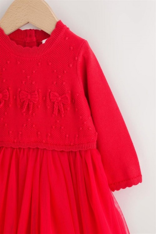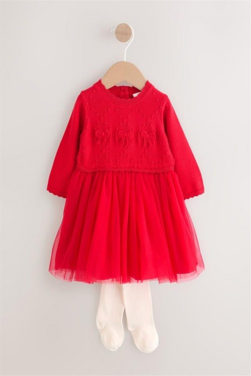 Облечете мъничето си за специален повод с тази очарователна рокля. Мекият плетен топ е с деликатни детайли с панделка и е съчетан с игрива мрежеста пола.