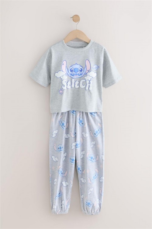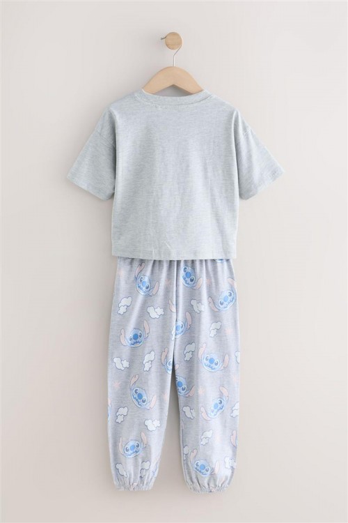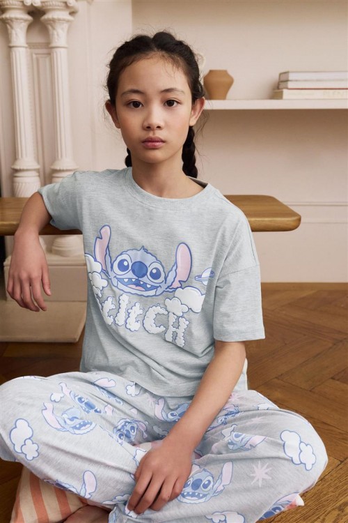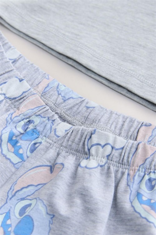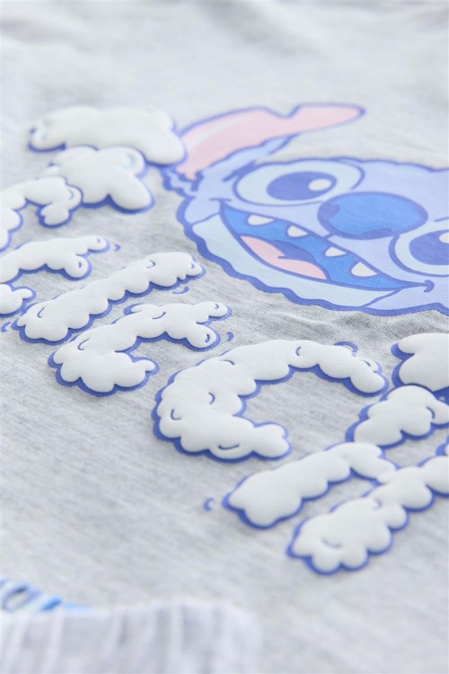 Уютен и сладък комплект пижама с любимия герой от Disney – Stitch. Състои се от светлосиво горнище с къс ръкав и голям принт на Stitch, както и долнище с цялостен десен от Stitch, облаци и звездички в пастелносини и розови нюанси. Изработен от мек памук за максимален комфорт – идеален за релакс и сладки сънища.