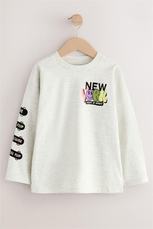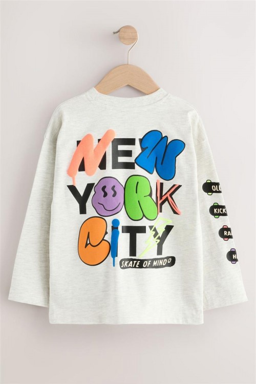 Модерна и удобна блуза в светлосив цвят с надпис “NEW YORK” в цветни букви и усмихнато лице върху гърдите. Левият ръкав е украсен с няколко кръгли емблеми “New York”, придаващи градски и стилен вид. Изработена от мек памучен плат – идеална за ежедневно носене.