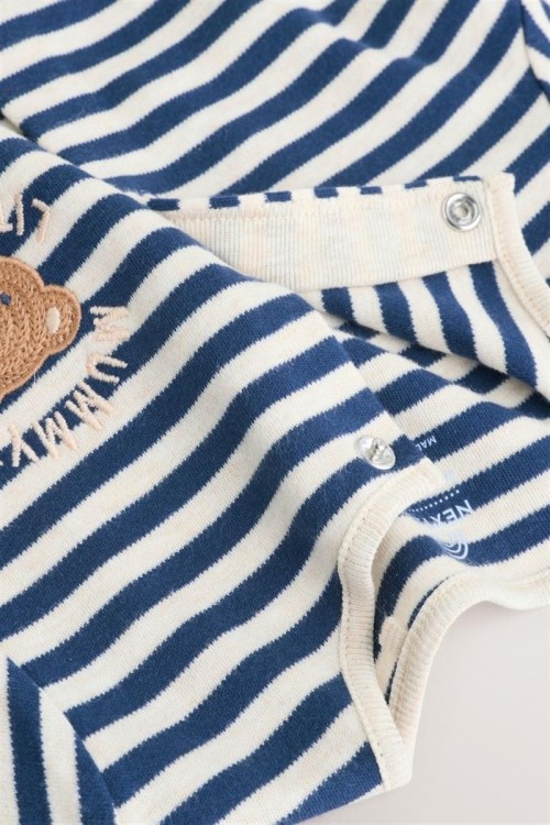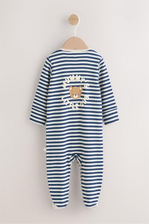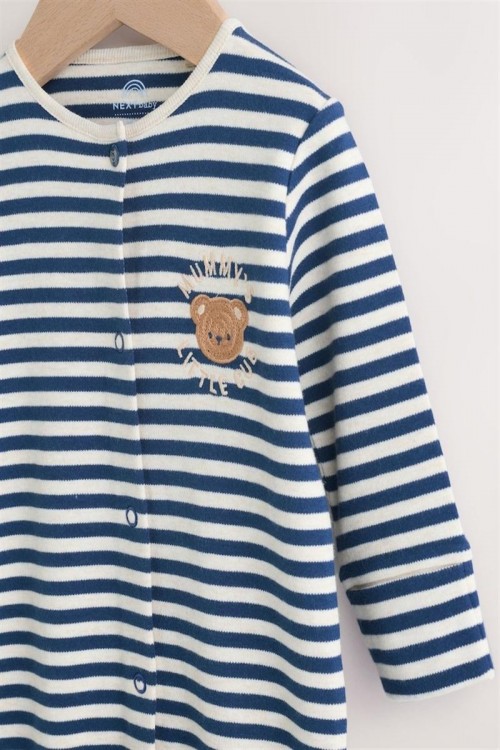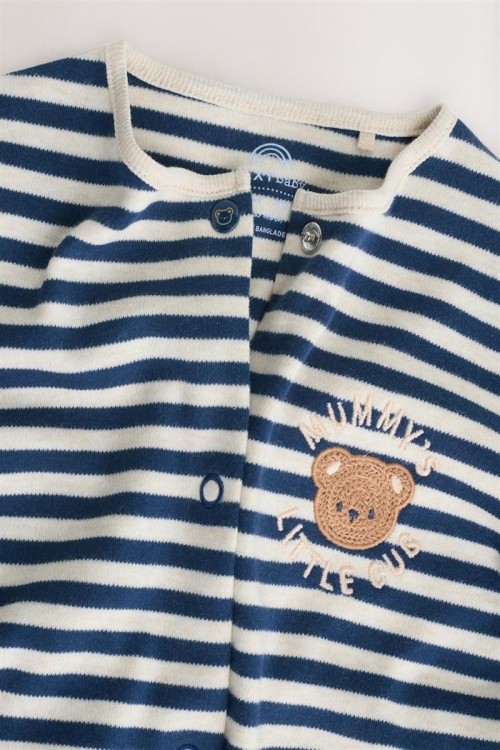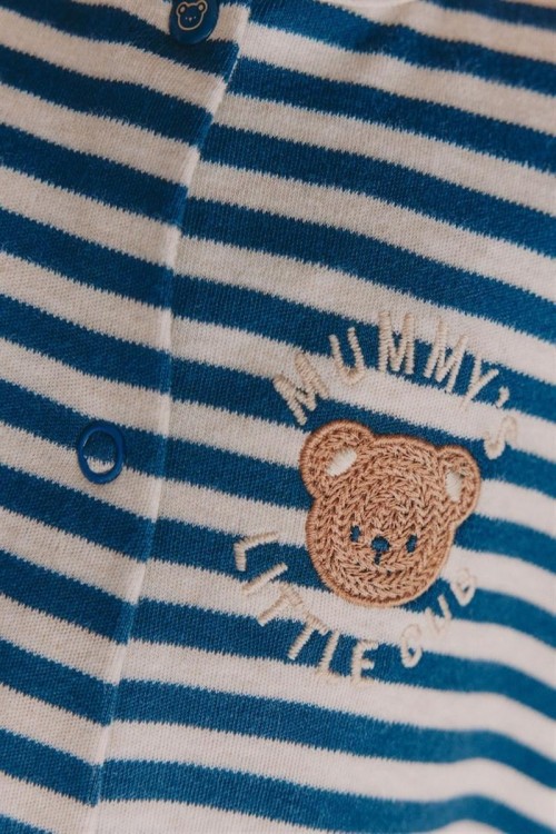 Уютна и сладка бебешка пижама със сини и бели хоризонтални райета. Има дълги ръкави, затворени крачета и предно закопчаване с тик-так копчета за лесно преобличане. Малка кафява апликация на мече с надпис “Little Bear” украсява гърдите. Изработен от мек памук, осигурява топлина и комфорт през целия ден.