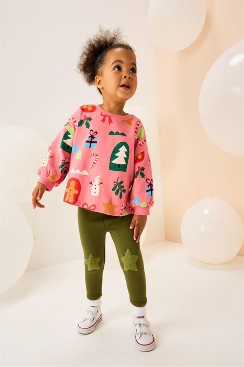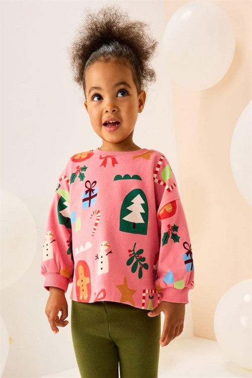 Жизнерадостен розов суитшърт с весела коледна щампа, включваща елхи, бастунчета, звезди, подаръци и джинджифилови човечета. Свободната кройка и меката материя осигуряват комфорт през целия ден – идеален за празнични игри и ежедневие през зимата. Комбинира се чудесно с клин или анцуг за уютна и весела визия.