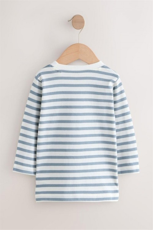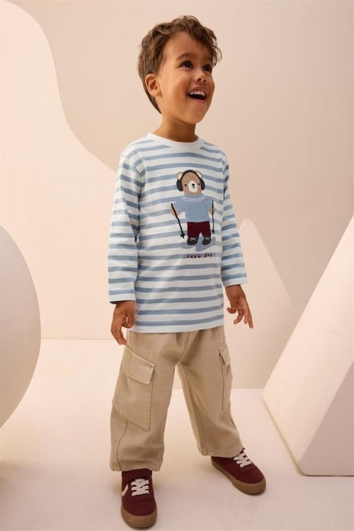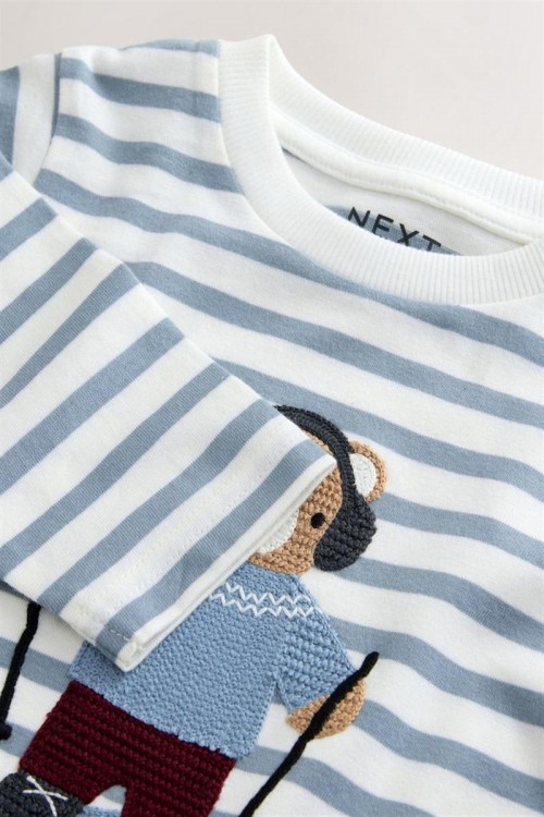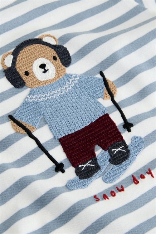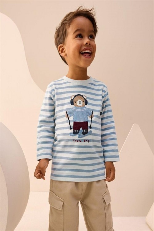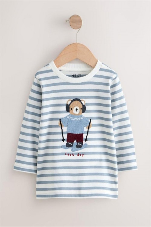 Удобна блузка с дълъг ръкав в светлосини и бели райета, украсена с апликация на меченце със слушалки и зимно облекло. Изработена от мек памук за максимален комфорт през целия ден – чудесен избор за ежедневни занимания и игри.