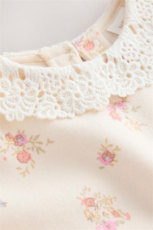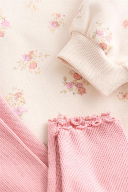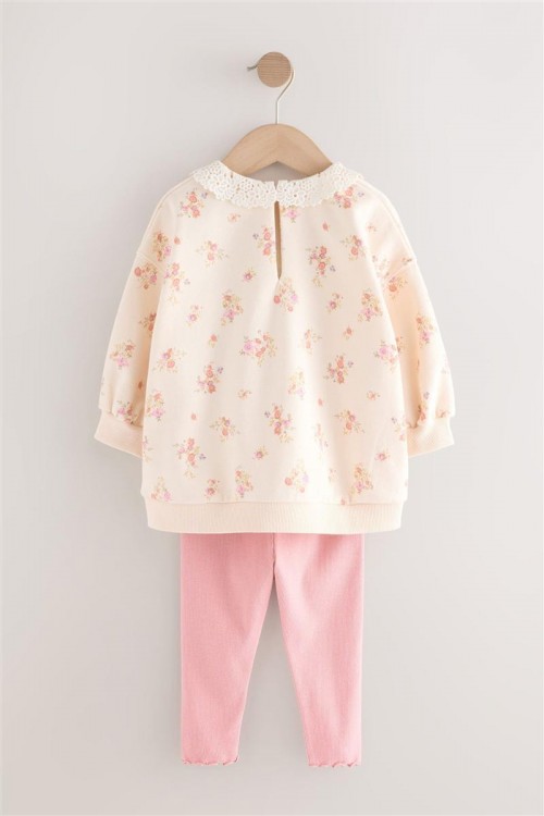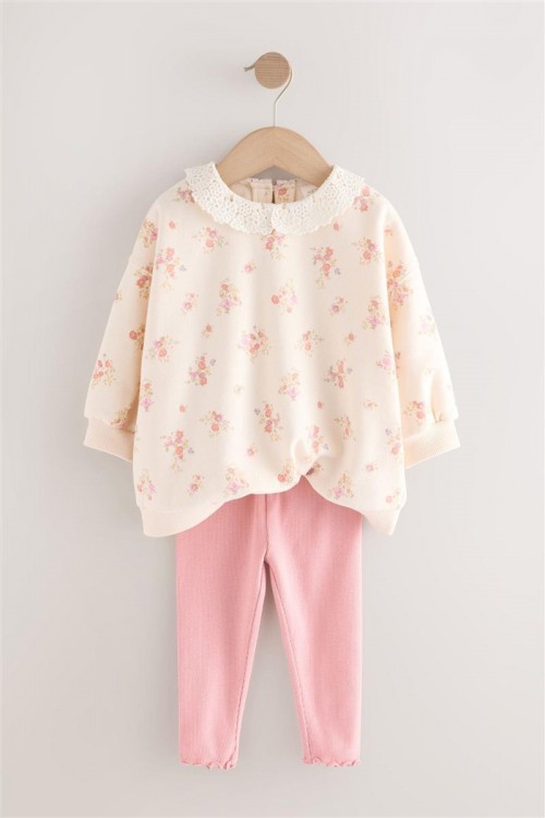 Очарователен комплект, включващ кремав суитшърт с фин флорален десен и нежна къдрава яка, комбиниран с едноцветен светлорозов клин. Суитшъртът е с удобна свободна кройка за лекота и комфорт, а клинът придава мек акцент и завършва визията. Идеален избор за ежедневие, разходки или уютни дни у дома.