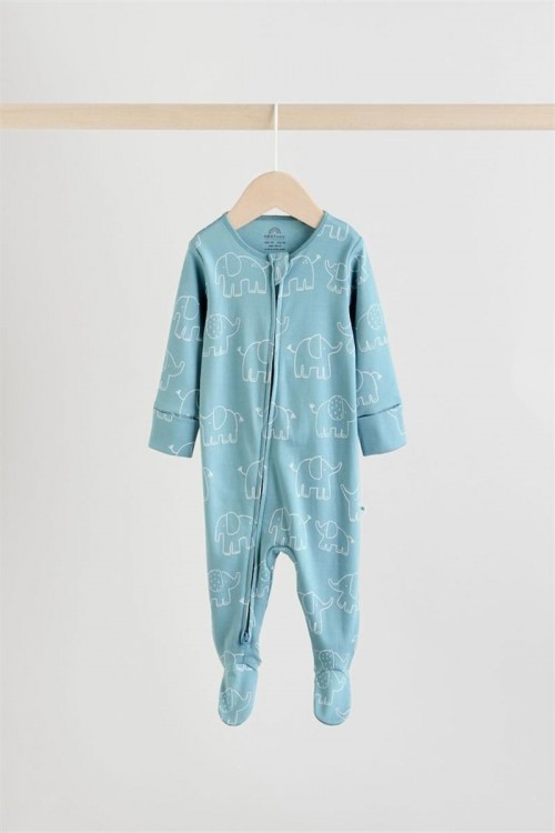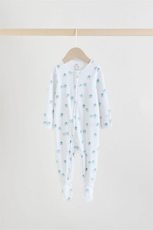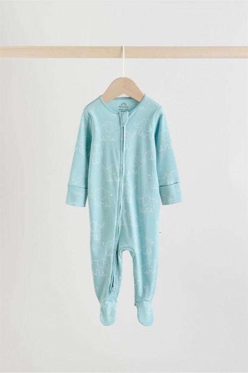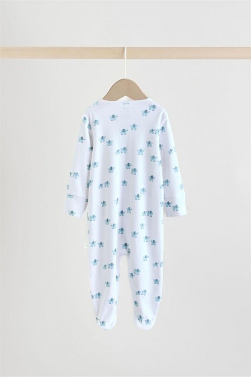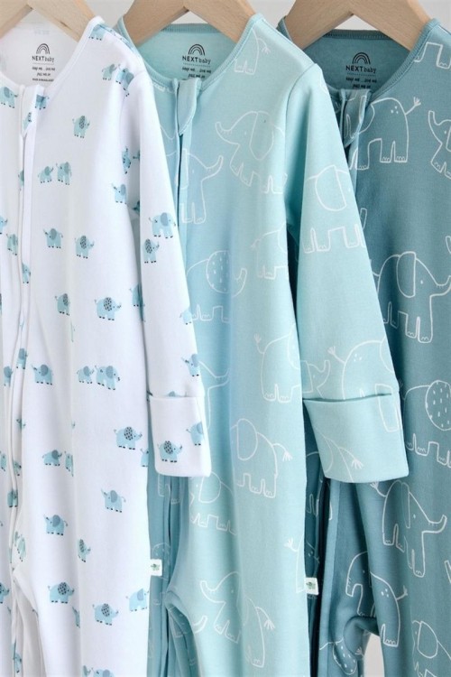 Kомплект от 3 сини пижамки. Супер меката памучна материя е нежна към кожата му, а двупосочното закопчаване с цип прави обличането и смяната на пелените бързи и лесни. С комбинация от едноцветни и линейни дизайни с принт на слонове, тези пижамки са завършени с подплатени вътрешни крачета и ръкавици против драскане с обръщане назад до 3-6 месеца.