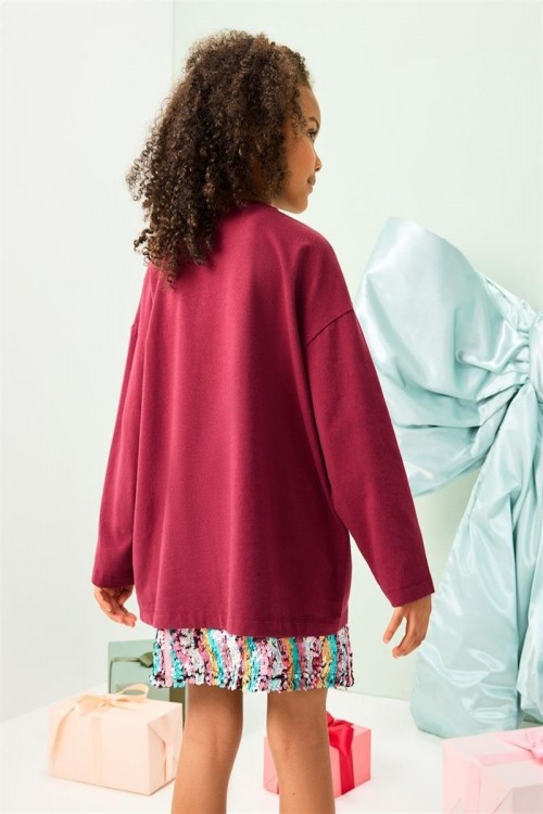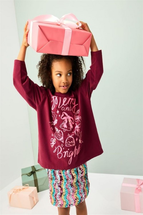 Бордо блуза с дълъг ръкав с празничен принт “Merry and Bright” в нежни розови тонове. Удобна и идеална за празничния сезон.